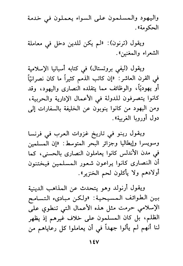 ويقول (رينو) في تاريخ غزوات العرب في فرنسا وسويسرا وإيطاليا وجزائر البحر المتوسط: (إن المسلمين في مدن الأندلس كانوا يعاملون النصارى بالحسنى، كما أن النصارى كانوا يراعون شعور المسلمين فيختنون أولادهم ولا يأكلون لحم الخنزير).
