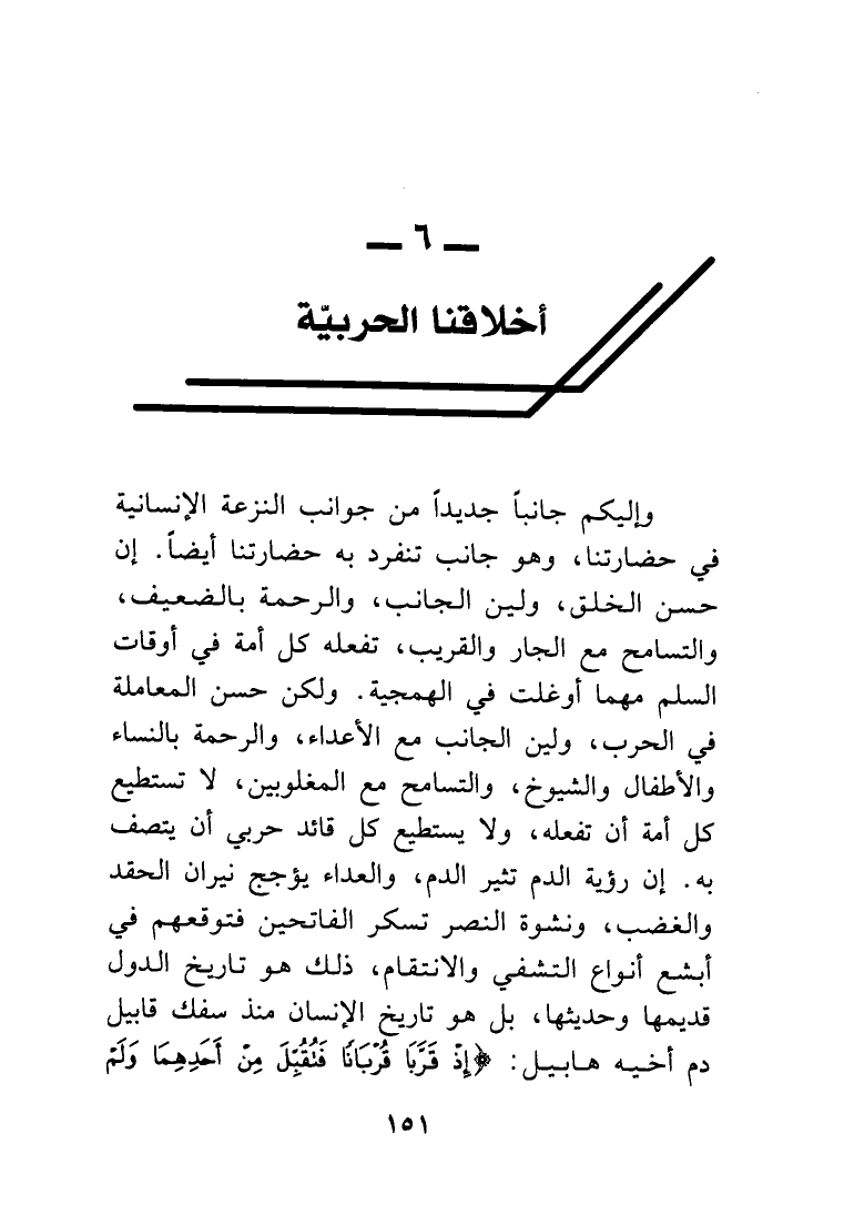 وإليكم جانباً جديداً من جوانب النزعة الإنسانية في حضارتنا، وهو جانب تنفرد به حضارتنا أيضاً. إن حسن الخلق، ولين الجانب، والرحمة بالضعيف، والتسامح مع الجار والقريب، تفعله كل أمة في أوقات السلم مهما أوغلت في الهمجية. ولكن حسن المعاملة في الحرب، ولين الجانب مع الأعداء، والرحمة بالنساء والأطفال والشيوخ، والتسامح مع المغلوبين، لا تستطيع كل أمة أن تفعله، ولا يستطيع كل قائد حربي أن يتصف به. إن رؤية الدم تثير الدم، والعداء يؤجج نيران الحقد والغضب، ونشوة النصر تسكر الفاتحين فتوقعهم في أبشع أنواع التشفي والانتقام، ذلك هو تاريخ الدول قديمها وحديثها، بل هو تاريخ الإنسان منذ سفك قابيل دم أخيه هابيل: {إِذْ قَرَّبَا قُرْبَانًا فَتُقُبِّلَ مِنْ أَحَدِهِمَا وَلَمْ