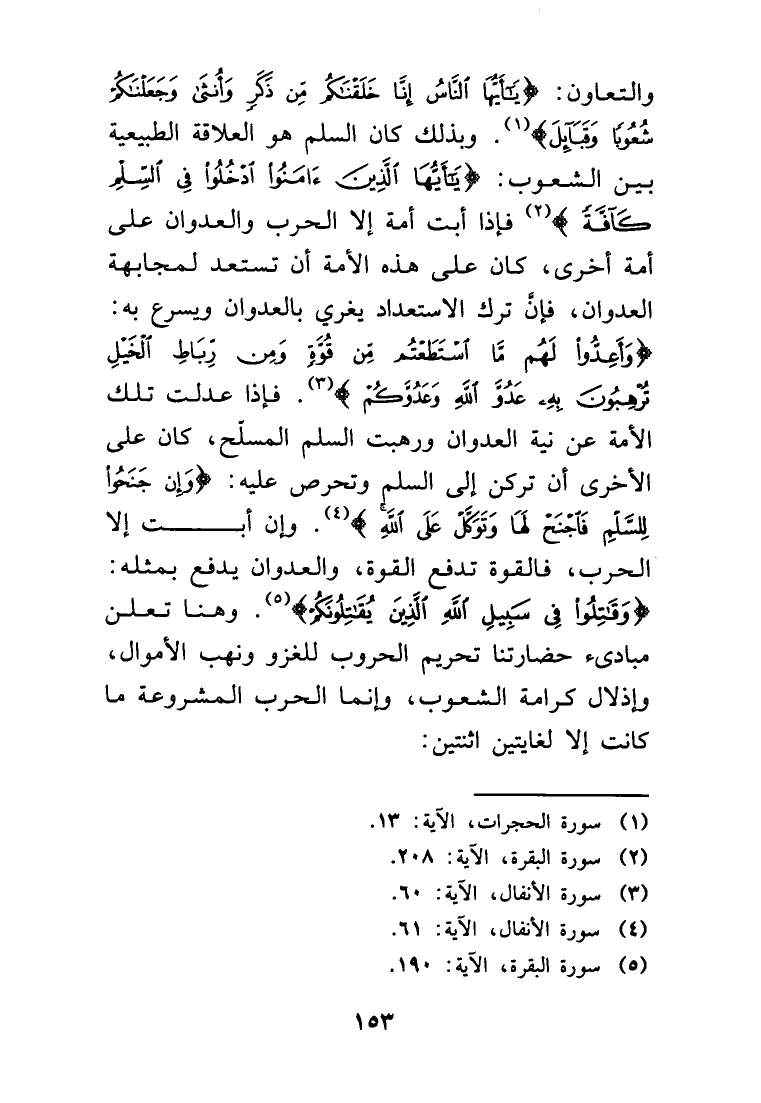 والتعاون: {يَا أَيُّهَا النَّاسُ إِنَّا خَلَقْنَاكُمْ مِنْ ذَكَرٍ وَأُنْثَى وَجَعَلْنَاكُمْ شُعُوبًا وَقَبَائِلَ لِتَعَارَفُوا} (¬1) وبذلك كان السلم هو العلاقة الطبيعية بين الشعوب: {يَا أَيُّهَا الَّذِينَ آَمَنُوا ادْخُلُوا فِي السِّلْمِ كَافَّةً} (¬2) فإذا أبت أمة إلا الحرب والعدوان على أمة أخرى، كان على هذه الأمة أن تستعد لمجابهة العدوان، فإن ترك الاستعداد يغري بالعدوان ويسرع به: {وَأَعِدُّوا لَهُمْ مَا اسْتَطَعْتُمْ مِنْ قُوَّةٍ وَمِنْ رِبَاطِ الْخَيْلِ تُرْهِبُونَ بِهِ عَدُوَّ اللَّهِ وَعَدُوَّكُمْ} (¬3). فإذا عدلت تلك الأمة عن نية العدوان ورهبت السلم المسلح، كان على الأخرى أن تركن إلى السلم وتحرص عليه: {وَإِنْ جَنَحُوا لِلسَّلْمِ فَاجْنَحْ لَهَا وَتَوَكَّلْ عَلَى اللَّهِ} (¬4). وإن أبت إلا الحرب، فالقوة تدفع القوة، والعدوان يدفع بمثله: {وَقَاتِلُوا فِي سَبِيلِ اللَّهِ الَّذِينَ يُقَاتِلُونَكُمْ} (¬5). وهنا تعلن مبادئ حضارتنا تحريم الحروب للغزو ونهب الأموال، وإذلال كرامة الشعوب، إنما الحرب المشروعة ما كانت إلا لغايتين اثنتين: