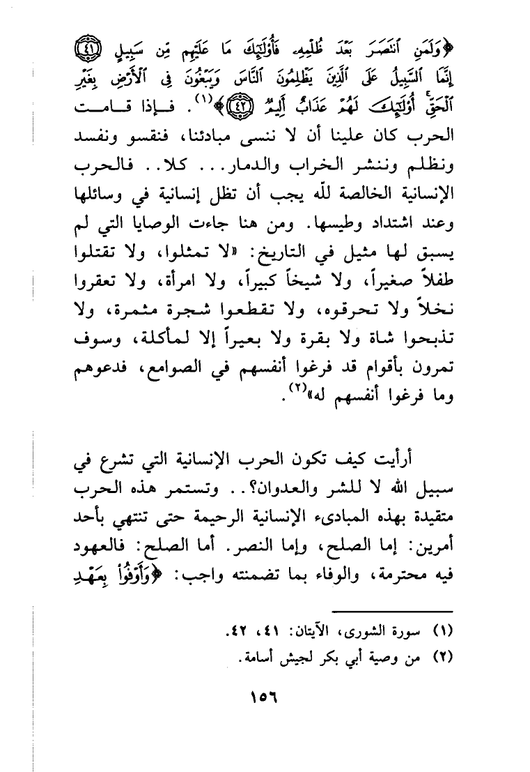 فإذا قامت الحرب كان علينا أن لا ننسى مبادئنا فنقسو ونفسد ونظلم وننشر الخراب والدمار .. كلا .. فالحرب الإنسانية الخالصة لله يجب أن تظل إنسانية في وسائلها وعند اشتداد وطيسها. ومن هنا جاءت الوصايا التي لم يسبق لها في التاريخ: (لا تمثلوا، ولا تقتلوا طفلاً صغيراً، ولاشيخاً كبيراً، ولا امرأة، ولا تعقروا نخلاً ولا تحرقوه، ولا تقطعوا شجرة مثمرة، ولا تذبحوا شاة ولا بقرة ولا بعيراً إلا لمأكلة، وسوف تمرون بأقوام قد فرغوا أنفسهم في الصوامع، فدعوهم وما فرغوا أنفسهم له) (¬1).