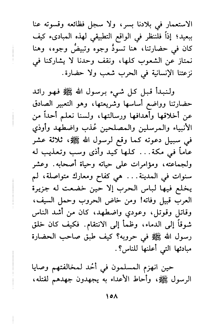 ولنبدأ قبل كل شيء برسول الله صلى الله عليه وسلم، فهو رائد حضارتنا وواضع أساسها وشريعتها، وهو التعبير الصادق عن أخلاقها وأهدافها ورسالتها، ولسنا نعلم أحداً من الأنبياء والمرسلين والمصلحين عُذب واضطهد وأوذي في سبيل دعوته كما وقع لرسول الله صلى الله عليه وسلم، ثلاثة عشر عاماً في مكة .. كلها كيد وأذى وسب وتعذيب له ولجماعته، ومؤامرات على حياته وحياة أصحابه. وعشر سنوات في المدينة .. هي كفاح ومعارك متواصلة، لم يخلع فيها لباس الحرب إلا حين خضعت له جزيرة العرب قبيل وفاته! ومن خاض الحروب وحمل السيف، وقاتل وقوتل، وعودي واضطهد، كان من أشد الناس شوقاً إلى الدماء وظمأ إلى الانتقام. فكيف كان خلق رسول الله في حروبه؟ كيف طبق صاحب الحضارة مبادئها التي أعلنها للناس؟ ..