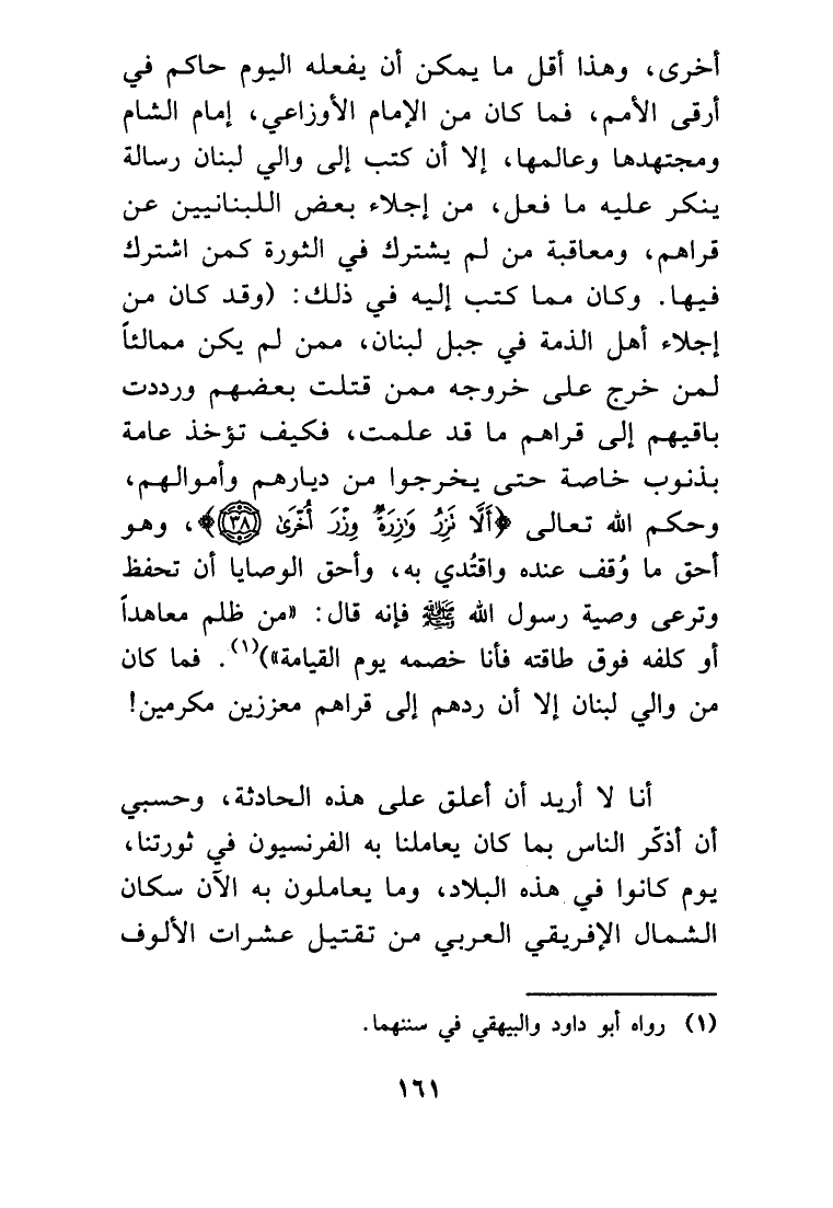 أخرى، وهذا أقل ما يمكن أن يفعله اليوم حاكم في أرقى الأمم، فما كان من الإمام الأوزاعي، إمام الشام ومجتهدها وعالمها، إلا أن كتب إلى والي لبنان رسالة ينكر عليه ما فعل، من إجلاء بعض اللبنانيين عن قراهم، ومعاقبة من لم يشترك في الثورة كمن اشترك فيها. فما كان من والي لبنان إلا أن ردهم إلى قراهم معززين مكرمين!