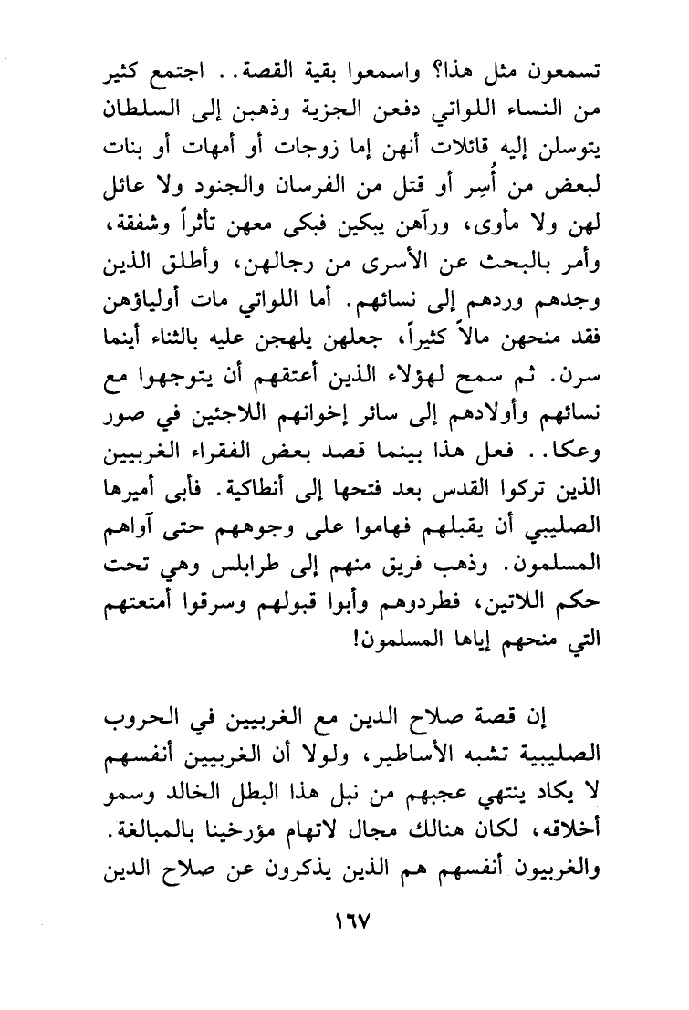 إن قصة صلاح الدين مع الغربيين في الحروب الصليبية تشبه الأساطير. ولولا أن الغربيين أنفسهم لا يكاد ينتهي عجبهم من نبل هذا البطل الخالد وسمو أخلاقه، لكان مجال لاتهام مؤرخينا بالمبالغة. والغربيون أنفسهم هم الذين يذكرون عن صلاح الدين