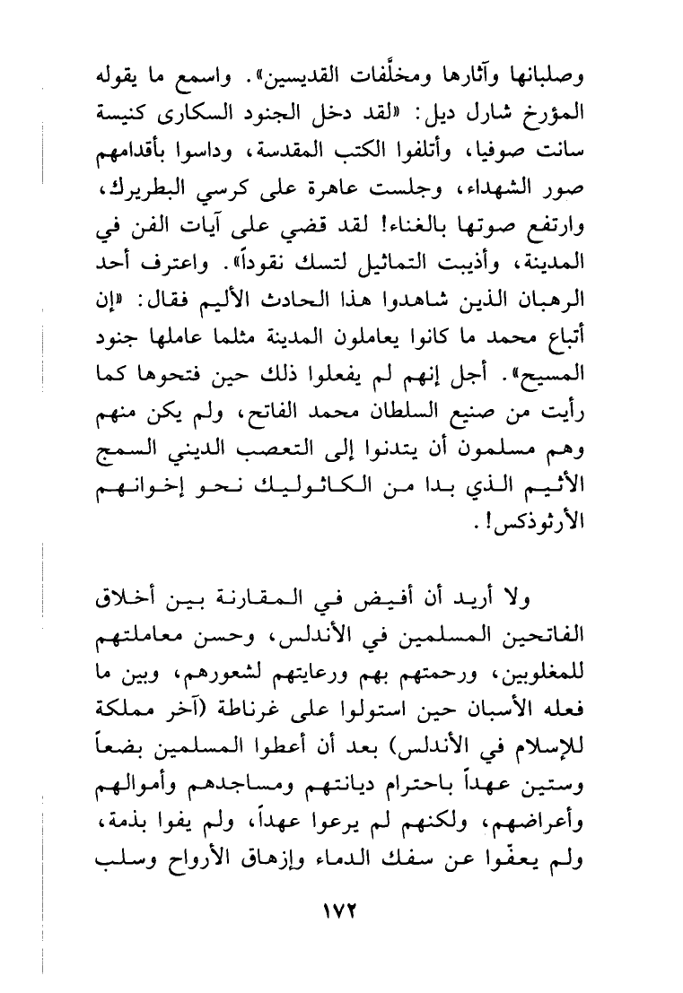 ولا أريد أن أفيض في المقارنة بين أخلاق الفاتحين المسلمين في الأندلس، وحسن معاملتهم للمغلوبين، ورحمتهم بهم ورعايتهم لشعورهم، وبين ما فعله الإسبان حين استولوا على غرناطة (آخر مملكة للإسلام في الأندلس)، بعد أن أعطوا المسلمين، بضعاً وستين عهداً باحترام ديانتهم ومساجدهم وأموالهم وأغراضهم، ولكنهم لم يرعوا عهداً، ولم يفوا بذمة، ولم يعفوا عن سفك الدماء وإزهاق الأرواح وسلب