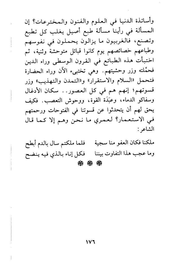 وأساتذة الدنيا في العلوم والفنون والمخترعات؟ إن المسألة في رأينا مسألة طبع أصيل يغلب كل تطبع وتصنع. لعمري ما نحن وهم إلا كما قال الشاعر: