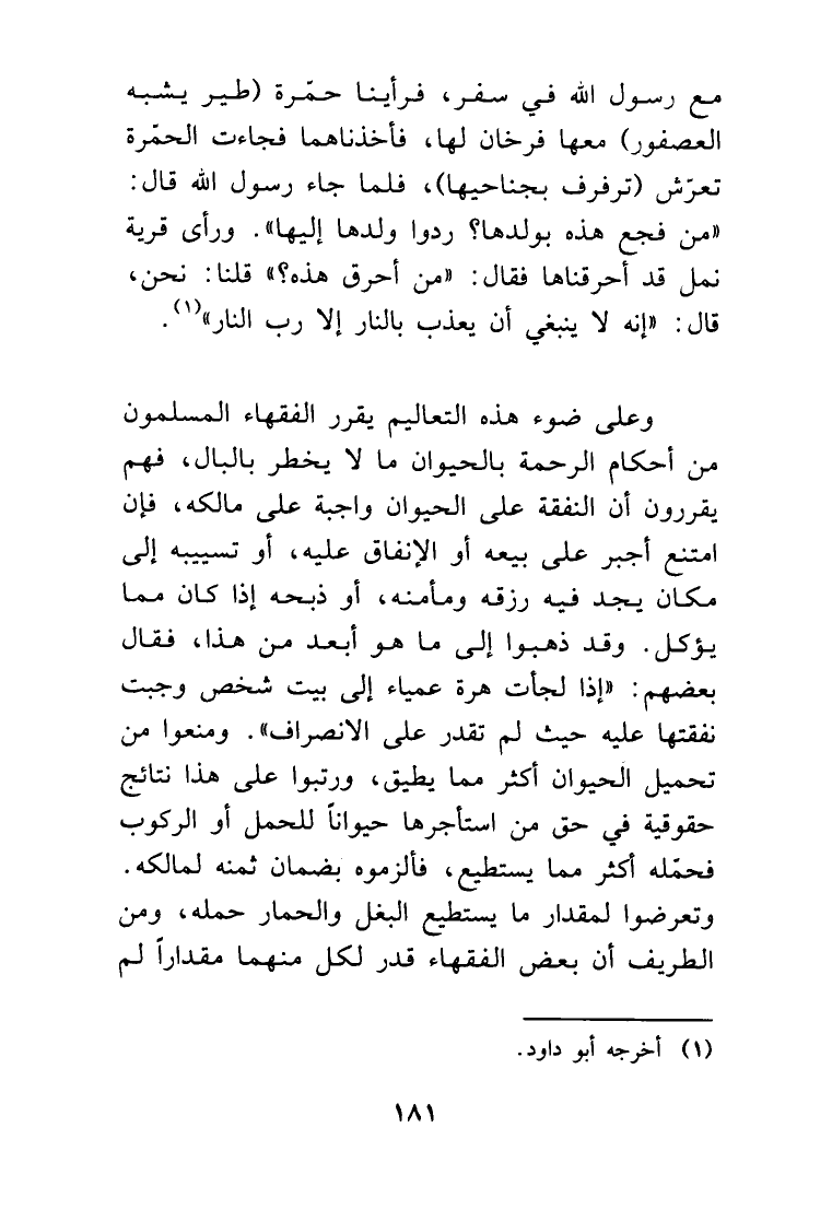 وعلى ضوء هذه التعاليم يقرر الفقهاء المسلمون من أحكام الرحمة بالحيوان ما لا يخطر بالبال. فهم يقررون أن النفقة على الحيوان واجبة على مالكه، فإن امتنع أجبر على بيعه أو الإنفاق عليه، أو تسييبه إلى مكان يجد فيه رزقه ومأمنه، أو ذبحه إذا كان مما يؤكل.