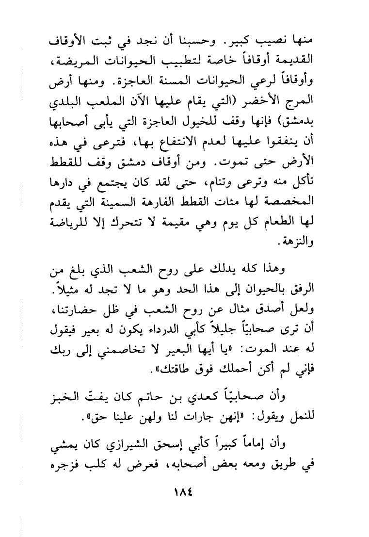منها نصيب كبير. وحسبنا أن نجد في ثبت الأوقاف القديمة أوقافاً خاصة لتطبيب الحيوانات المريضة، وأوقافاً لرعي الحيوانات المُسنة العاجزة.