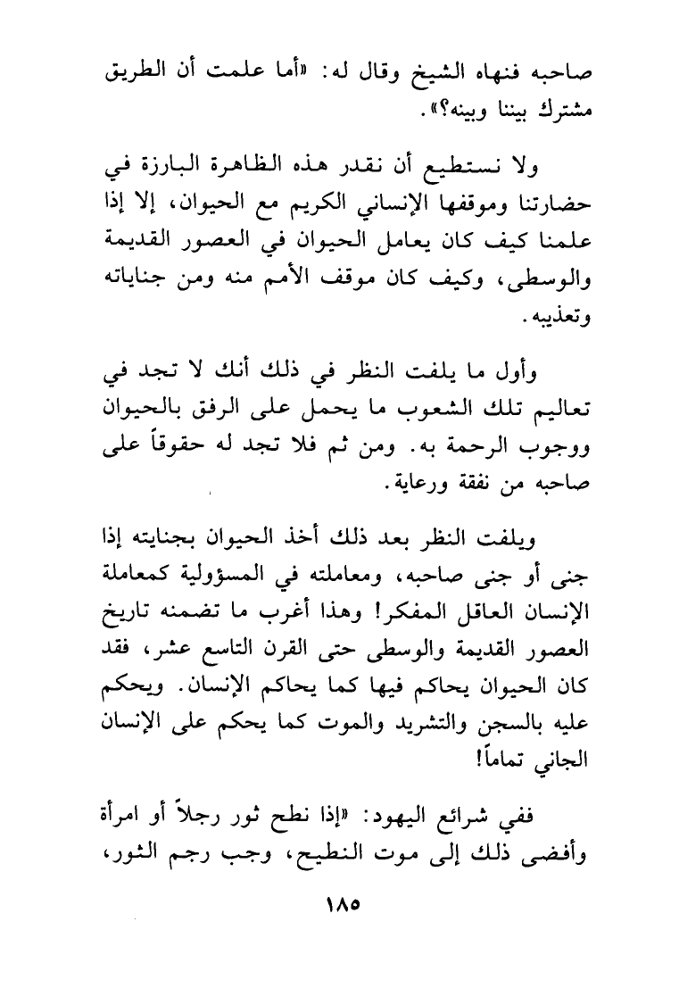 ولا نستطيع أن نقدر هذه الظاهرة البارزة في حضارتنا وموقفها الإنساني الكريم مع الحيوان، إلا إذا علمنا كيف كان يعامل الحيوان في العصور القديمة والوسطى، وكيف كان موقف الأمم منه من جناياته وتعذيبه.