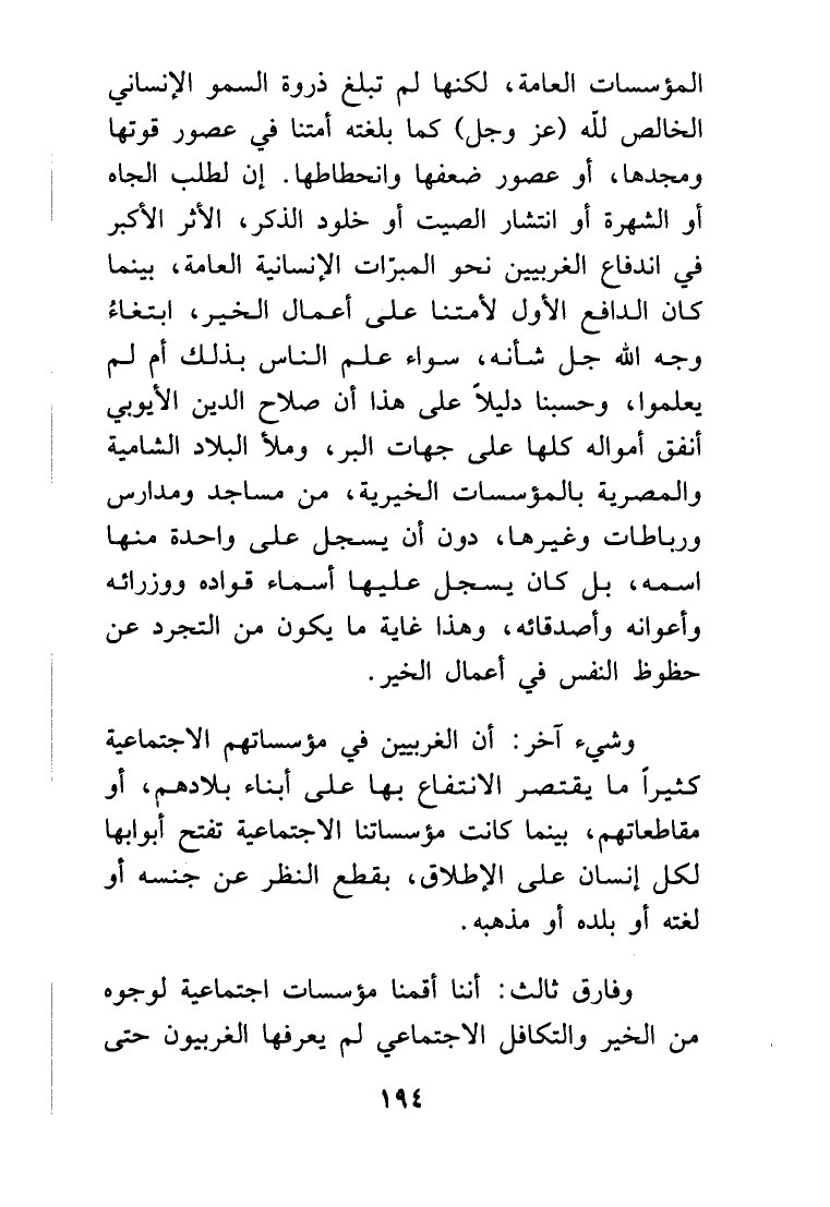 وشيء آخر: أن الغربيين في مؤسساتهم الاجتماعية كثيراً ما يقتصر الانتفاع بها على أبناء بلادهم، أو مقاطعاتهم، بينما كانت مؤسساتنا الاجتماعية تفتح أبوابها لكل إنسان على الإطلاق، بقطع النظر عن جنسه أو لغته أو بلده أو مذهبه ..