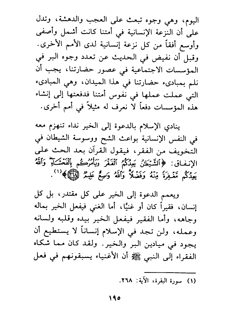 اليوم، وهي وجوه تبعث على العجب والدهشة، وتدل على أن النزعة الإنسانية في أمتنا كانت أشمل وأصفى وأوسع أفقاً من كل نزعة إنسانية لدى الأمم الأخرى. وقبل أن نفيض في الحديث عن تعدد وجوه البر في المؤسسات الاجتماعية في عصور حضارتنا يجب أن نلم بمبادئ حضارتنا في هذا الميدان، وهي المبادئ التي عملت عملها في نفوس أمتنا فدفعتها إلى إنشاء هذه المؤسسات دفعاً لا نعرف له مثيلاً في أمم أخرى.
