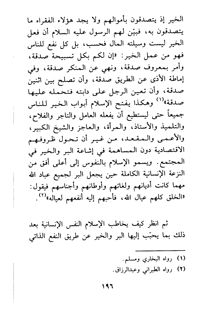 الخيرات إذ يتصدقون بأموالهم ولا يجد هؤلاء الفقراء ما يتصدقون به، فبيّن الرسول عليه السلام أن فعل الخير ليست وسيلته المال فحسب، بل كل نفع للناس فهو من عمل الخير: (إن لكم بكل تسبيحة صدقة، وأمر بمعروف صدقة، ونهي عن المنكر صدقة، وفي إماطة الأذى عن الطريق صدقة، وأن تصلح بين اثنين صدقة، وأن تعين الرجل على دابته فتحمله عليها صدقة) (¬1). وهكذا يفتح الإسلام أبواب الخير للناس جميعاً.