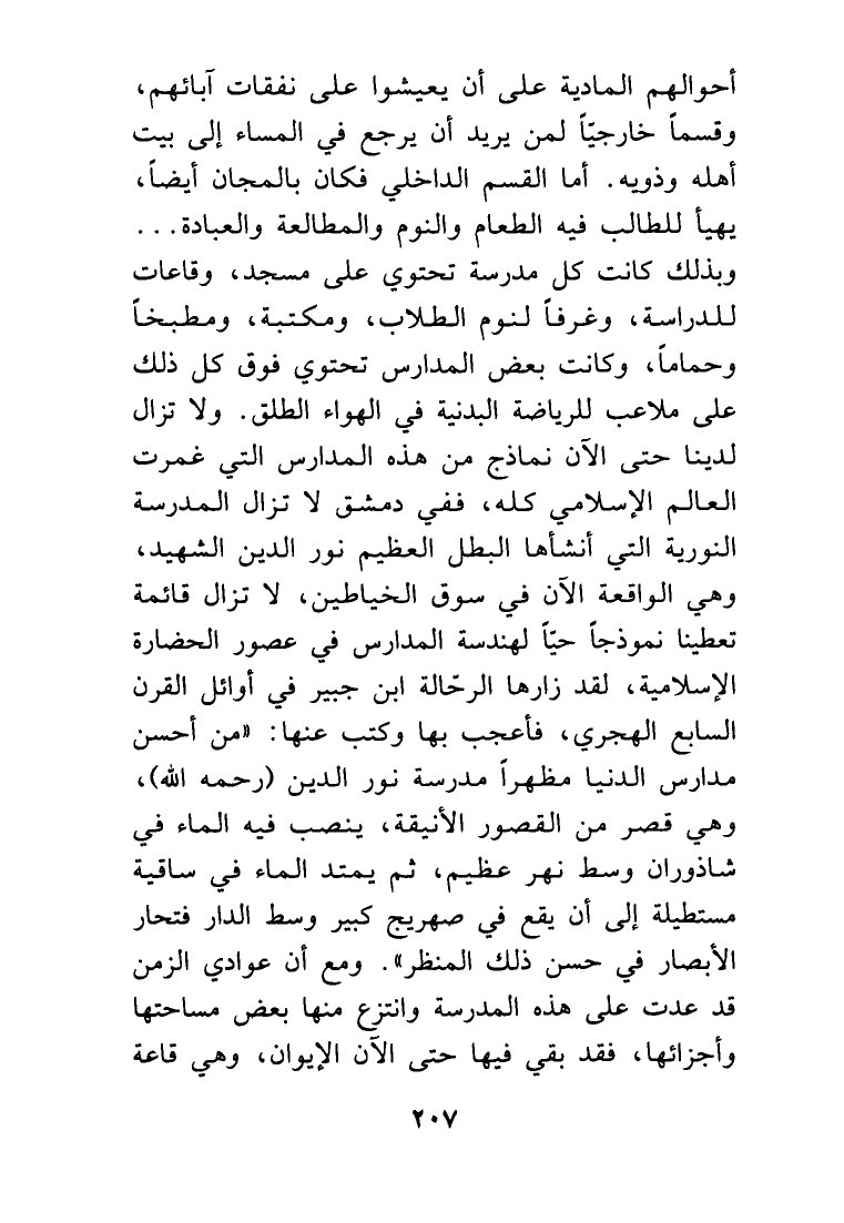 أحوالهم المادية علي أن يعيشوا علي نفقات آبائهم، وقسما خارجياً لمن يريد أن يرجع في المساء إلى بيت أهله وذويه. أما القسم الداخلي فكان بالمجان أيضا، يهيأ للطالب فيه الطعام والنوم والمطالعة والعبادة .. وبذلك كانت كل مدرسة تحتوي علي مسجد، وقاعات للدراسة، وغرف لنوم الطلاب، ومكتبة، ومطبخ وحمام. وكانت بعض المدارس تحتوي فوق ذلك على ملاعب للرياضة البدنية في الهواء الطلق. ولا تزال لدينا حتى الآن نماذج من هذه المدارس التي غمرت العالم الإسلامي كله، ففي دمشق لا تزال المدرسة النورية التي أنشأها البطل العظيم نور الدين الشهيد، وهي الواقعة الآن في سوق الخياطين، ولا تزال قائمة تعطينا نموذجا حيا لهندسة المدارس في عصور الحضارة الإسلامية، لقد زارها الرحالة ابن جبير في أوائل القرن السابع الهجري، فأعجب بها وكتب عنها. ونجد مثلها في حلب في مدارس الشعبانية والعثمانية والخسروية، حيث لا يزال فيها للطلاب غرف يسكنونها وقاعات للدراسة، وقد كانوا من قبل يأكلون فيها، ثم عدل عن ذلك إلى راتب معلوم في آخر كل شهر يعطى للطلاب المنتسبين إليها.