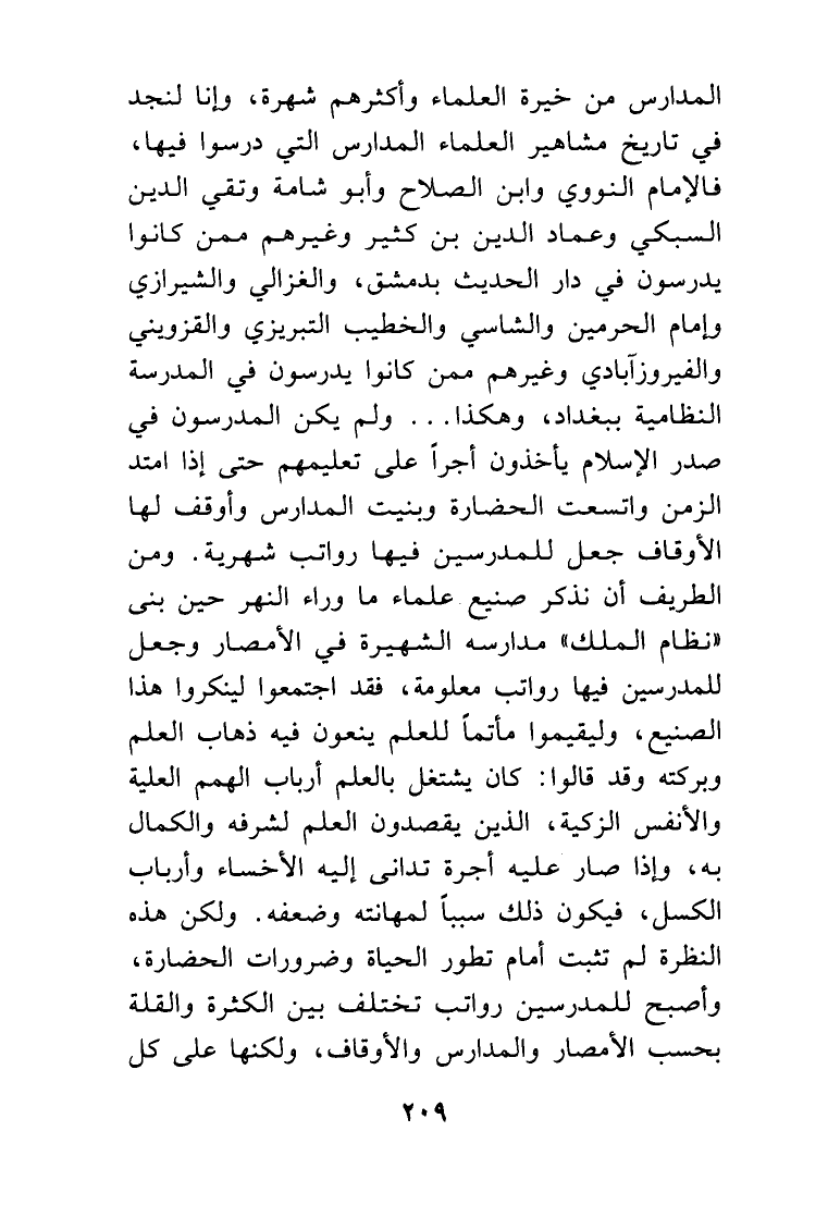 المدارس من خيرة العلماء وأكثرهم شهرة، وإنّا لنجد في تاريخ مشاهير العلماء المدارس التي درسوا فيها، فالإمام النووي وابن الصلاح وأبو شامة وتقي الدين السبكي وعماد الدين بن كثير وغيرهم ممن كانوا يدرسون في دار الحديث بدمشق، والغزالي والشيرازي وإمام الحرمين والشاسي والخطيب والتبريزي والقزويني والفيروز أبادي وغيرهم ممن كانوا يدرسون في المدرسة النظامية ببغداد، وهكذا .. ولم يكن المدرسون في صدر الإسلام يأخذون أجرا على تعليمهم حتى إذا امتد الزمن واتسعت الحضارة وبنيت المدارس وأوقف لها الأوقاف جعل للمدرسين فيها رواتب شهرية.