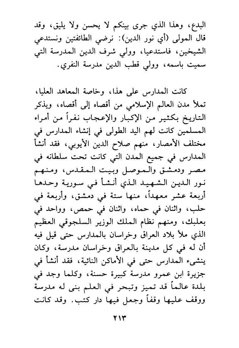 كانت المدارس على هذا، وخاصة المعاهد العليا، تملأ مدن العالم الإسلامي من أقصاه إلى أقصاه ويذكر التاريخ بكثير من الإكبار والإعجاب نفرا من أمراء المسلمين كانت لهم اليد الطولى في إنشاء المدارس في مختلف الأمصار، منهم صلاح الدين الأيوبي، فقد أنشأ المدارس في جميع المدن التي كانت تحت سلطانه في مصر ودمشق والموصل وبيت المقدس، ومنهم نور الدين الشهيد الذي أنشأ في سورية وحدها أربعة عشر معهداً، منها ستة في دمشق، وأربعة في حلب، واثنان في حماه، واثنان في حمص، وواحد في بعلبك، ومنهم نظام الملك الوزير السلجوقي العظيم الذي ملأ بلاد العراق وخراسان بالمدارس حتى قيل فيه، إن له في كل مدينة بالعراق وخراسان مدرسة، وكان ينشئ المدارس حتى في الأماكن النائية، فقد أنشأ في جزيرة ابن عمرو مدرسة كبيرة حسنة، وكلما وجد في بلدة عالما قد تميز وتبحر في العلم بنى له مدرسة ووقف عليها وقفا وجعل فيها دار كتب. وقد كانت