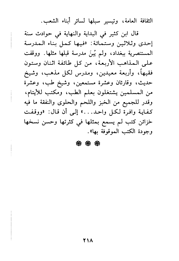 قال ابن كثير في البداية والنهاية في حوادث سنة إحدى وثلاثين وستمائة: (فيها كمل بناء المدرسة المستنصرية ببغداد، ولم يُبنَ مدرسة قبلها مثلها، ووقفت على المذاهب الأربعة، من كل طائفة إثنان وستون فقيها، وأربعة معيدين، ومدرس لكل مذهب، وشيخ حديث، وقارئان وعشرة مستمعين، وشيخ طب، وعشرة من المسلمين يشتغلون بعلم الطب، ومكتب للأيتام، وقدر للجميع من الخبز واللحم والحلوى والنفقة ما فيه كفاية وافرة لكل واحد .. ) إلى أن قال: (ووقفت خزائن كتب لم يسمع بمثلها في كثرتها وحسن نسخها، وجودة الكتب الموقوفة بها).