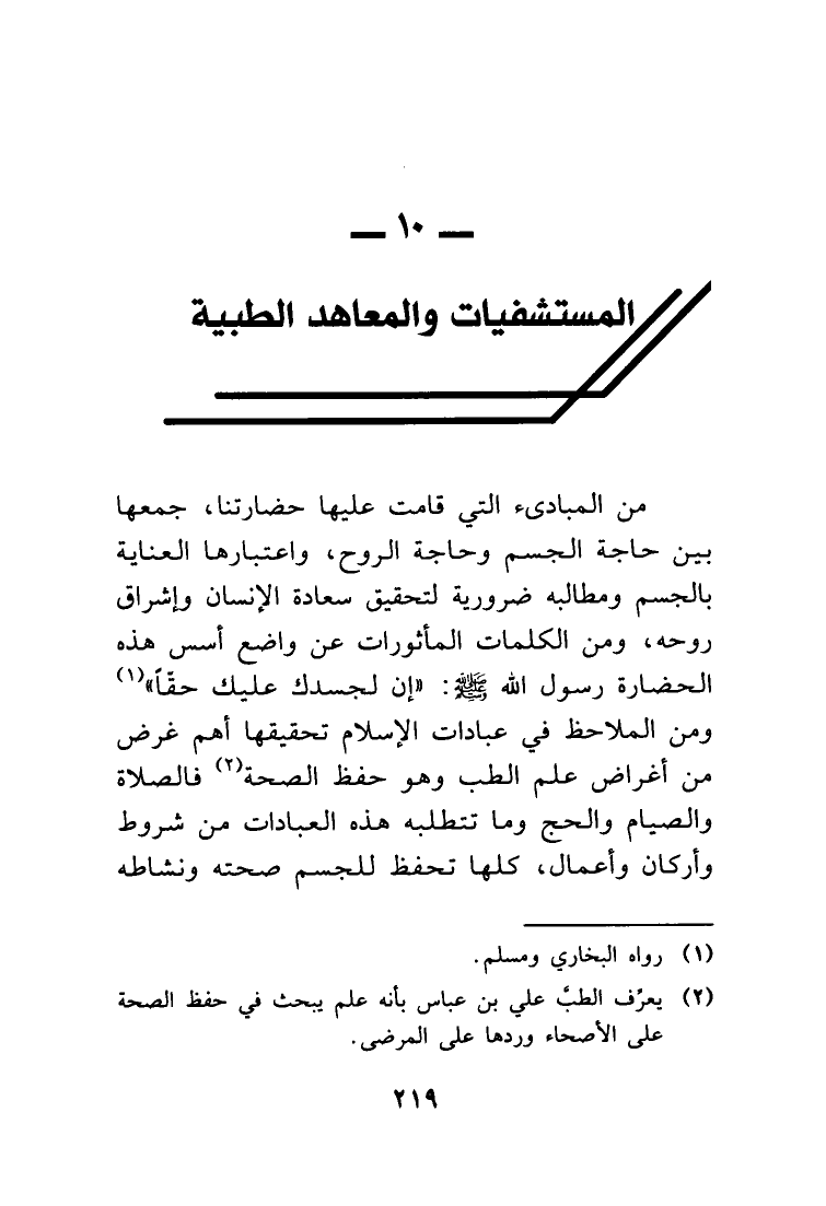 من المبادئ التي قامت عليها حضارتنا، جمعها بين حاجة الجسم وحاجة الروح، واعتبارها العناية بالجسم، ومطالبه ضرورية لتحقيق سعادة الإنسان وإشراق روحه، ومن الكلمات المأثورات عن واضع أسس هذه الحضارة رسول الله صلى الله عليه وسلم: (إن لجسدك عليك حقاً) (¬1) ومن الملاحظ في عبادات الإسلام تحقيقها أهم غرض من أغراض علم الطب وهو حفظ الصحة (¬2) فالصلاة والصيام والحج وما تتطلبه هذه العبادات من شروط وأركان وأعمال، كلها تحفظ للجسم صحته ونشاطه