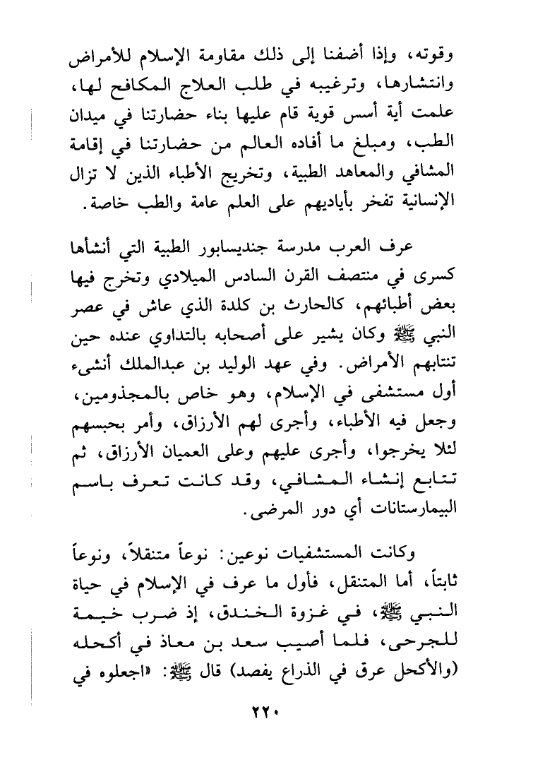 وقوته، وإذا أضفنا إلى ذلك مقاومة الإسلام للأمراض وانتشارها، وترغيبه في طلب العلاج المكافح لها، علمت أسس قوية قام عليها بناء حضارتنا في ميدان الطب، ومبلغ ما أفاده العلم من حضارتنا في إقامة المشافي والمعاهد الطبية، وتخريج الأطباء الذين لا تزال الإنسانية تفخر بأياديهم على العلم عامة والطب خاصة.