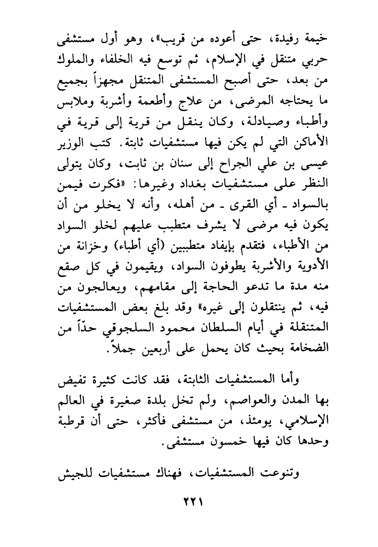 خيمة رفيدة، حتى أعوده من قريب، وهو أول مستشفى حربي متنقل في الإسلام، ثم توسع فيه الخلفاء والملوك من بعد، حتى أصبح المستشفى المتنقل مجهزاً بجميع ما يحتاجه المرضى، من علاج وأطعمة وأشربة وملابس وأطباء وصيادلة، وكان ينقل من قرية إلى قرية في الأماكن التي لم يكن فيها مستشفيات ثابتة.
