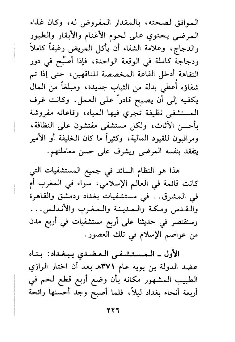 الأول- المستشفى العضدي ببغداد: بناه عضد الدولة بن بويه عام 371هبعد أن اختار الرازي الطبيب المشهور مكانه بأن وضع أربع قطع لحم في أربع أنحاء ببغداد ليلاً، فلما أصبح وجد أحسنها رائحة