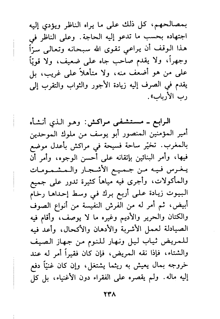 الرابع- مستشفى مراكش: وهو الذي أنشأه أمير المؤمنين المنصور أبو يوسف من ملوك الموحدين بالمغرب. تخيّر ساحة فسيحة في مراكش بأعدل موضع فيها، وأمر البنائين بإتقانه على أحسن الوجوه، وأمر أن يغرس فيه من جميع الأشجار والمشمومات والمأكولات، وأجرى فيه مياهاً كثيرة تدور على جميع البيوت زيادة على أربع بُرَكٍ في وسط إحداها رخام أبيض، ثم أمر له من الفرش النفيسة من أنواع الصوف والكتان والحرير والأديم وغيره ما لا يوصف، وأقام فيه الصيادلة لعمل الأشربة والأدهان والأكحال، وأعدّ فيه للمريض ثياب ليل ونهار من جهاز الصيف والشتاء، فإذا نقه المريض، فإن كان فقيراً أمر له عند خروجه بمال يعيش به ريثما يشتغل، وإن كان غنياً دفع إليه ماله. ولم يقصره على الفقراء دون الأغنياء، بل كان
