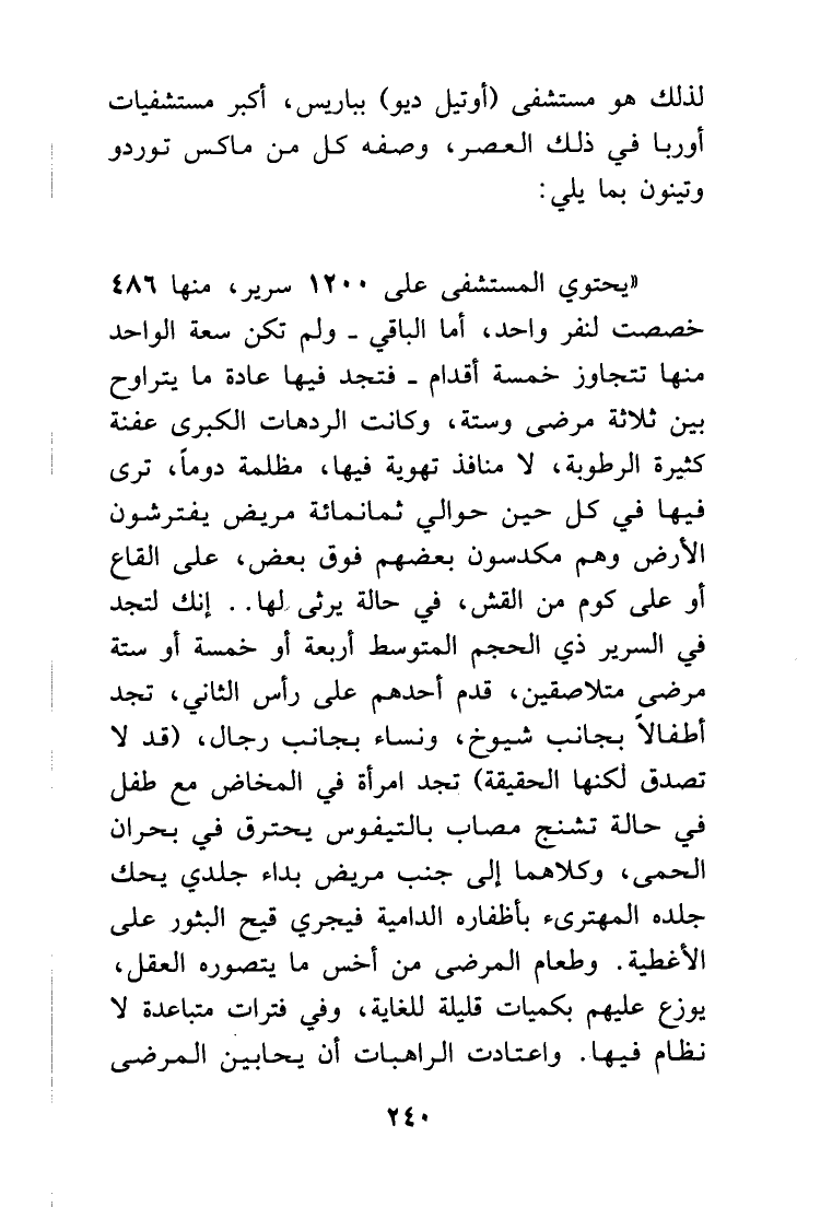 (يحتوي المستشفى على 1200 سريراً، منها 486 خصصت لنفر واحد، أما الباقي - ولم تكن سعة الواحد منها تتجاوز خمسة أقدام - فتجد فيها عادة ما يتراوح بين ثلاثة مرضى وستة، وكانت الردهات الكبرى عفنة كثيرة الرطوبة، لا منافذ تهوية فيها، مظلمة دوماً، ترى فيها في كل حين حوالي ثمانمائة مريض يفترشون الأرض وهم مكدسون بعضهم فوق بعض، على القاع، أو على كوم من القش، في حالة يُرثى لها .. إنك لتجد في السرير ذي الحجم المتوسط أربعة أو خمسة أو ستة مرضى متلاصقين، قدم أحدهم على رأس الثاني، تجد أطفالاً بجانب شيوخ، ونساء بجانب رجال، (قد لا تصدق لكنها الحقيقة) تجد امرأة في المخاض مع طفل في حالة تشنج مصاب بالتيفوس يحترق في بحران الحمى، وكلاهما إلى جنب مريض بداء جلدي يحك جلده المهترئ بأظفاره الدامية فيجري قيح البثور على الأغطية. وطعام المرضى من أخس ما يتصوره العقل، يوزع عليهم بكميات قليلة للغاية، وفي فترات متباعدة لا نظام فيها. واعتادت الراهبات أن يحابين المرضى
