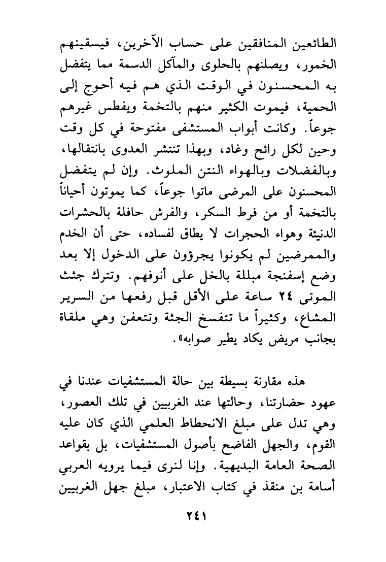 هذه مقارنة بسيطة بين حالة المستشفيات عندنا في عهود حضارتنا، وحالتها عند الغربيين في تلك العصور، وهي تدل على مبلغ الانحطاط العلمي الذي كان عليه القوم، والجهل الفاضح بأصول المستشفيات، بل بقواعد الصحة العامة البديهية.