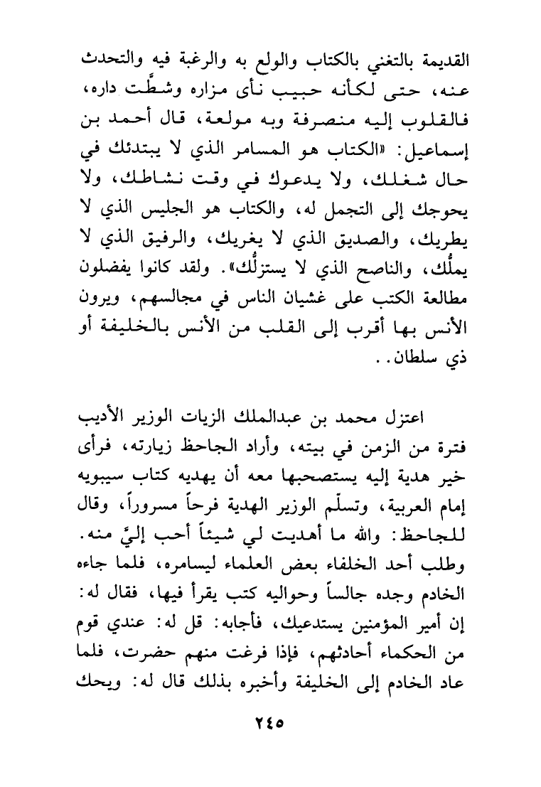 القديمة بالتغني بالكتاب والولع به والرغبة فيه والتحدث عنه، حتى لكأنه حبيب نأى مزاره وشطّت داره، فالقلوب إليه منصرفة وبه مولعة، قال أحمد بن إسماعيل: (الكتاب هو المسامر الذي يبتدئك في حال شغلك، ولا يدعوك في وقت نشاطك، ولا يحوجك إلى التجمل له، والكتاب هو الجليس الذي لا يطريك، والصديق الذي لا يغريك، والرفيق الذي لا يملُّك، والناصح الذي لا يستزلُّك). ولقد كانوا يفضلون مطالعة الكتب على غشيان الناس في مجالسهم، ويرون الأنس بها أقرب إلى القلب من الأنس بالخليفة أو ذي سلطان.