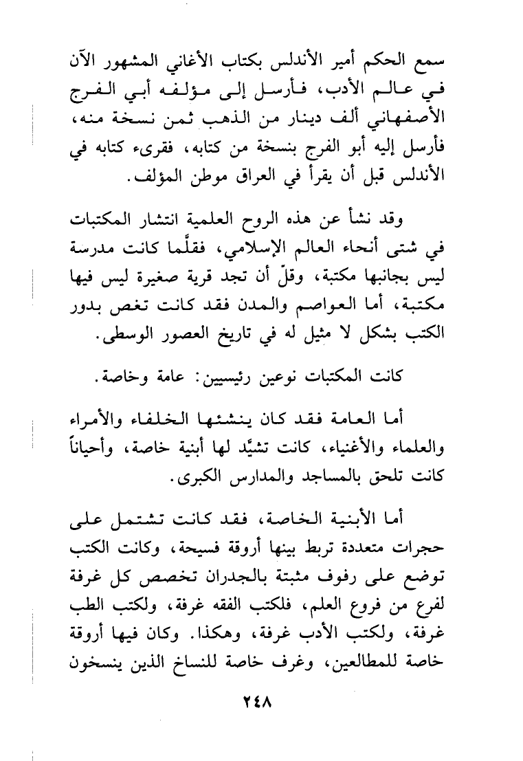 وقد نشأ عن هذه الروح العلمية انتشار المكتبات في شتى أنحاء العالم الإسلامي، فقلّما كانت مدرسة ليس بجانبها مكتبة، وقلّ أن تجد قرية صغيرة ليس فيها مكتبة، أما العواصم والمدن فقد كانت تغص بدور الكتب بشكل لا مثيل له في تاريخ العصور الوسطى.
