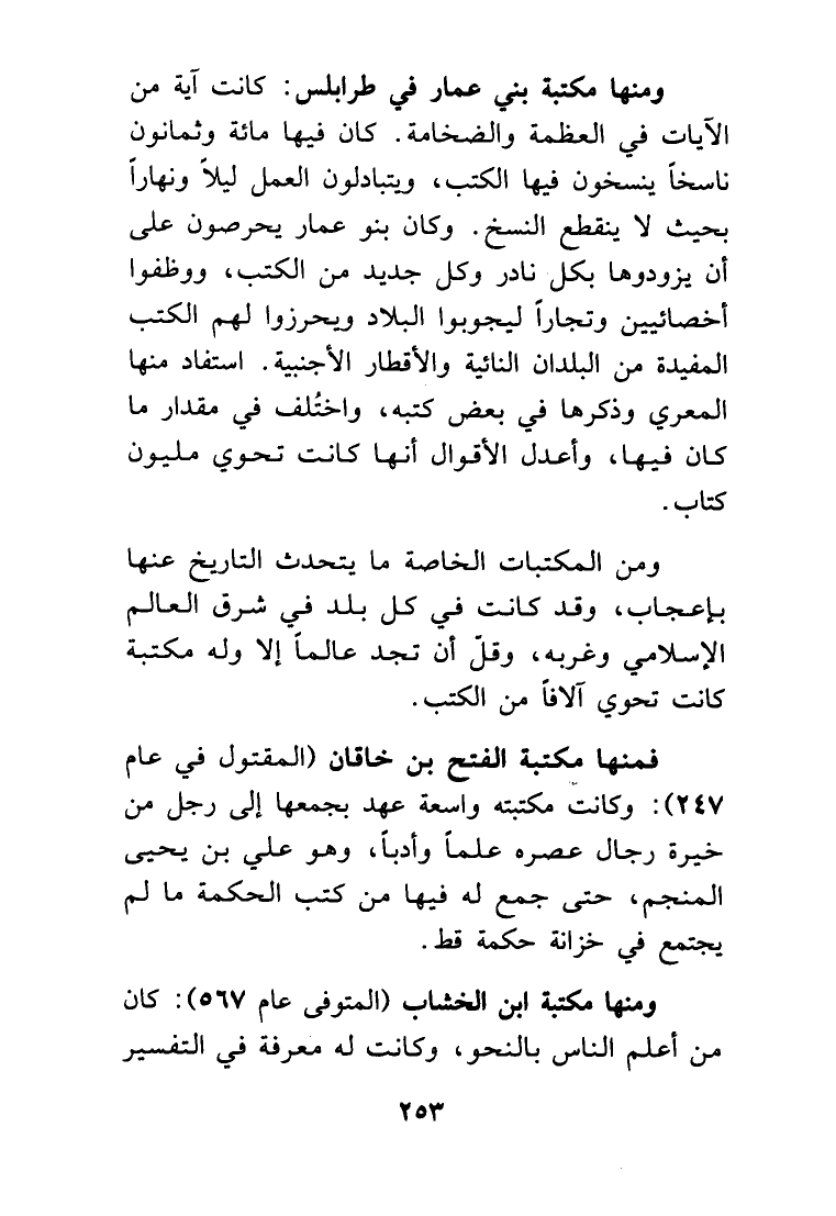 ومنها مكتبة بني عمار في طرابلس. كانت آية من الآيات في العظمة والضخامة. كان فيها مائة وثمانون ناسخاً ينسخون فيها الكتب، ويتبادلون العمل ليلاً ونهاراً بحيث لا ينقطع النسخ.