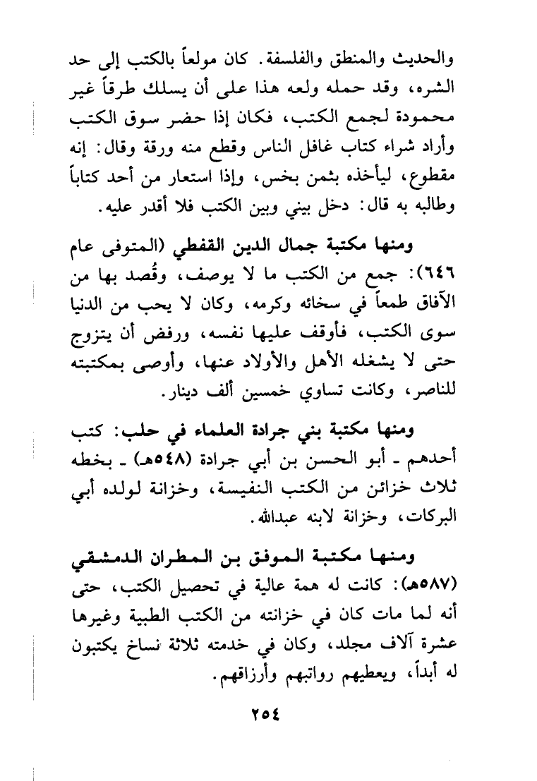 ومنها مكتبة جمال الدين القفطي (المتوفى عام 646هـ)، جمع من الكتب ما لا يوصف، وقُصد بها من الآفاق طمعاً في سخائه وكرمه، وكان لا يحب من الدنيا سوى الكتب، فأوقف عليها نفسه، ورفض أن يتزوج حتى لا يشغله الأهل والأولاد عنها، وأوصى بمكتبته للناصر، وكانت تساوي خمسين ألف دينار.
