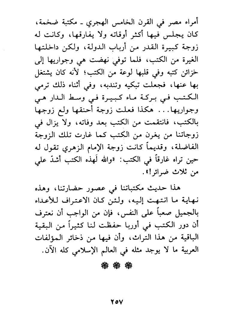 هذا حديث مكتباتنا في عصور حضارتنا، وهذه نهاية ما انتهت إليه، ولئن كان الاعتراف للأعداء بالجميل صعباً على النفس، فإن من الواجب أن نعترف أن دور الكتب في أوروبا حفظت لنا كثيراً من البقية الباقية من هذا التراث، وأن فيها من ذخائر المؤلفات العربية ما لا يوجد في العالم الإسلامي كله الآن.