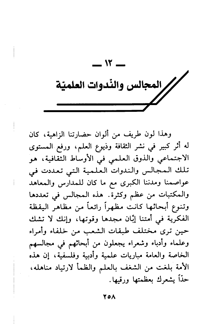 وهذا لون طريف من ألوان حضارتنا الزاهية، كان له أثر كبير في نشر الثقافة وذيوع العلم، ورفع المستوى الاجتماعي والذوق العلمي في الأوساط الثقافية هو تلك المجالس والندوات العلمية التي تعددت في عواصمنا ومدننا الكبرى مع ما كان للمدارس والمعاهد والمكتبات من عظم وكثرة. هذه المجالس في تعددها وتنوع أبحاثها كانت مظهراً رائعاً من مظاهر اليقظة الفكرية في أمتنا إبّان مجدها وقوتها، وإنك لا تشك حين ترى مختلف طبقات الشعب من خلفاء وأمراء وعلماء وأدباء وشعراء .. يجعلون من أبحاثهم في مجالسهم الخاصة والعامة مباريات علمية وأدبية وفلسفية، إن هذه الأمة بلغت من الشغف بالعلم والظمأ لارتياد مناهله، حداً يشعرك بعظمتها ورقيها.