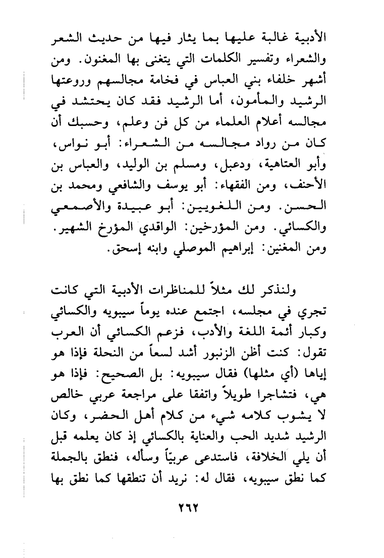 الأدبية غالبة عليها بما يثار فيها من حديث الشعر والشعراء وتفسير الكلمات التي يتغنى بها المغنون، ومن أشهر خلفاء بني العباس في فخامة مجالسهم وروعتها الرشيد والمأمون، أما الرشيد فقد كان يحتشد في مجالسه أعلام العلماء من كل فن وعلم، وحسبك أن كان من رواد مجالسه من الشعراء: أبو نواس، وأبو العتاهية، ودعبل، ومسلم بن الوليد، والعباس بن الأحنف، ومن الفقهاء: أبو يوسف والشافعي ومحمد بن الحسن، ومن اللغويين، أبو عبيدة والأصمعي والكسائي، ومن المؤرخين: الواقدي المؤرخ الشهير. ومن المغنين: إبراهيم الموصلي وابنه إسحق.