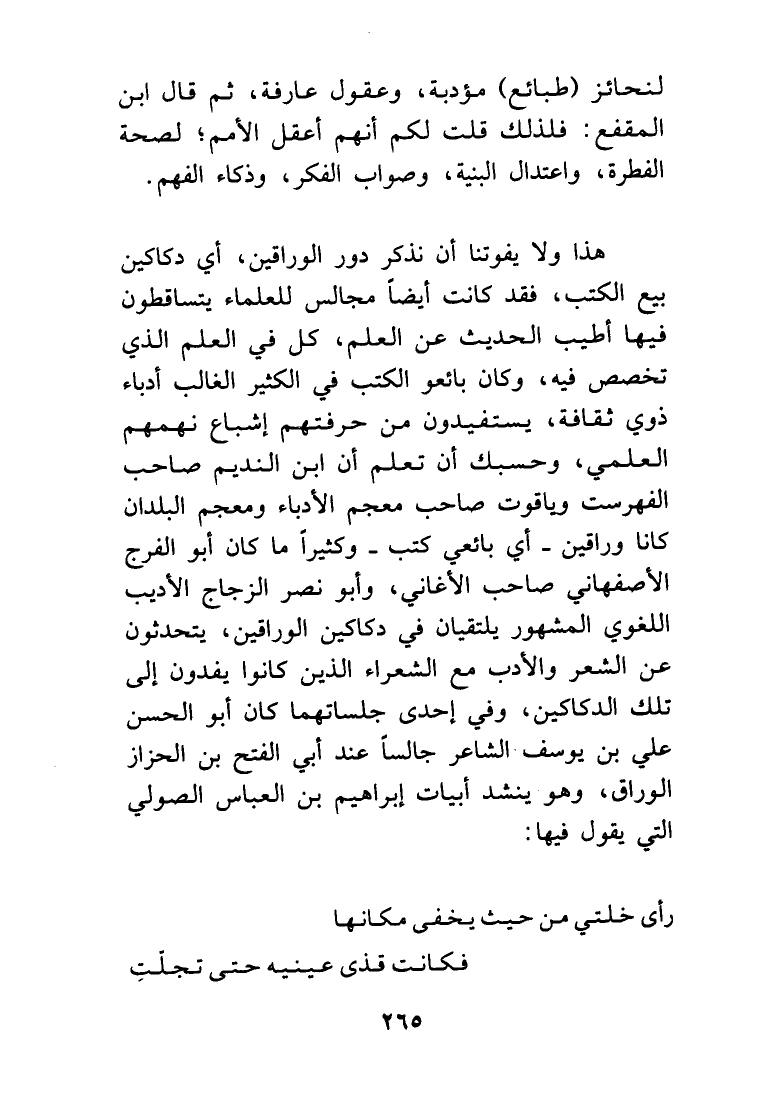 هذا ولا يفوتنا أن نذكر دور الوراقين، أي دكاكين بيع الكتب، فقد كانت أيضاً مجالس للعلماء يتساقطون فيها أطيب الحديث عن العلم، كل في العلم الذي تخصص فيه، وكان بائعو الكتب في الكثير الغالب أدباء ذوي ثقافة، يستفيدون من حرفتهم إشباع نهمهم العلمي، وحسبك أن تعلم أن ابن النديم صاحب (الفهرست) وياقوت صاحب (معجم الأدباء) و (معجم البلدان) كانا وراقين - أي بائعي كتب - وكثيراً ما كان أبو الفرج الأصفهاني صاحب الأغاني، وأبو نصر الزجاج الأديب اللغوي المشهور يلتقيان في دكاكين الوراقين، يتحدثون عن الشعر والأدب مع الشعراء الذين كانوا يفدون إلى تلك الدكاكين.
