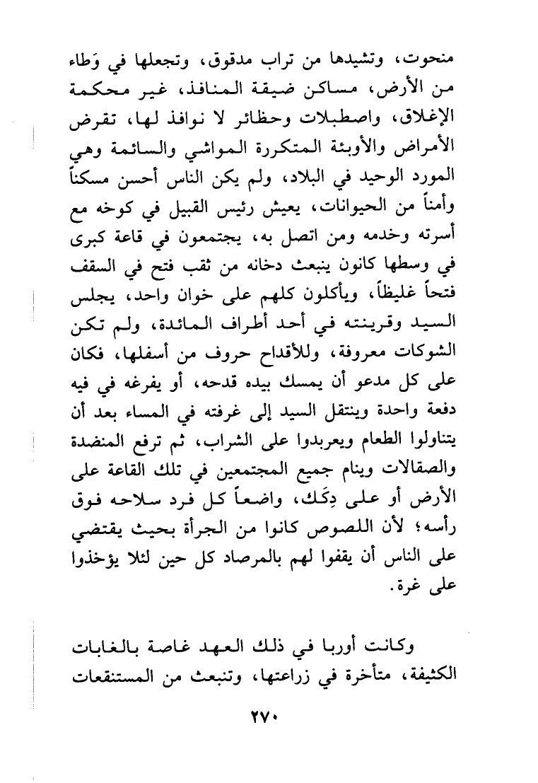 منحوت، وتشيدها من تراب مدقوق، وتجعلها في وطاء من الأرض، مساكن ضيقة المنافذ، غير محكمة الإغلاق، واصطبلات وحظائر لا نوافذ لها، تقرض الأمراض والأوبئة المتكررة المواشي والسائمة وهي المورد الوحيد في البلاد، ولم يكن الناس أحسن مسكناً وأمناً من الحيوانات، يعيش رئيس القبيلة في كوخه مع أسرته وخدمه ومن اتصل به، يجتمعون في قاعة كبرى في وسطها كانون ينبعث دخانه من ثقب فتح في السقف فتحاً غليظاً، ويأكلون كلهم على خوان واحد، يجلس السيد وقرينته في أحد أطراف المائدة، ولم تكن الشوكات معروفة، وللأقداح حروف من أسفلها، فكان على كل مدعو أن يمسك بيده قدحه، أو يفرغه في فيه دفعة واحدة. وينتقل السيد إلى غرفته في المساء بعد أن يتناولوا الطعام ويعربدوا على الشراب، ثم ترفع المنضدة والصقالات، وينام جميع المجتمعين في تلك القاعة على الأرض. أو على دِكَك، واضعاً كل فرد سلاحه فوق رأسه، لأن اللصوص كانوا من الجرأة بحيث يقتضي على الناس أن يقفوا لهم بالمرصاد كل حين لئلا يؤخذوا على غرة.