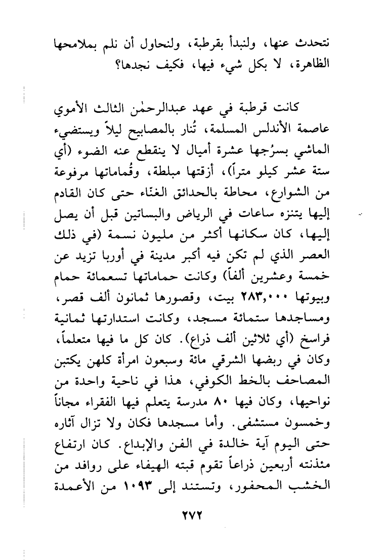 كانت قرطبة في عهد عبد الرحمن الثالث الأموي عاصمة الأندلس المسلمة، تنار بالمصابيح ليلاً ويستضيء الماشي بسُرجها عشرة أميال لا ينقطع عنه الضوء، (أي ستة عشر كيلومتراً)، أزقتها مبلطة، وقماماتها مرفوعة من الشوارع، محاطة بالحدائق الغناء حتى كان القادم إليها يتنزه ساعات في الرياض والبساتين قبل أن يصل إليها، كان سكانها أكثر من مليون نسمة (في ذلك العصر الذي لم تكن فيه أكبر مدينة في أوروبا تزيد عن خمسة وعشرين ألفاً) وكانت حماماتها تسعمائة حمام وبيوتها 283.000 بيت وقصورها ثمانون ألف قصر، ومساجدها ستمائة مسجد، وكانت استدراتها ثمانية فراسخ (أي ثلاثين ألف ذراع). كان كل ما فيها متعلماً، وكان في ربضها الشرقي مائة وسبعون امرأة كلهن يكتبن المصاحف بالخط الكوفي، هذا في ناحية واحدة من نواحيها، وكان فيها 80 مدرسة يتعلم فيها الفقراء مجاناً، وخمسون مستشفى. وأما مسجدها فكان ولا تزال آثاره حتى اليوم آية خالدة في الفن والإبداع. كان ارتفاع مئذنته أربعين ذراعاً تقوم قبته الهيفاء على روافد من الخشب المحفور، وتستند إلى 1093 من الأعمدة