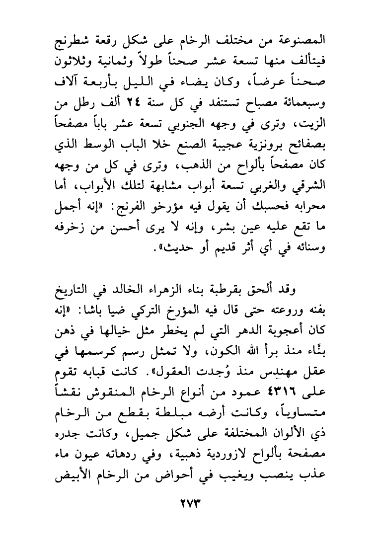 المصنوعة من مختلف الرخام على شكل رقعة الشطرنج فيتألف منها تسعة عشر صحناً طولاً وثمانية وثلاثون صحناً عرضا، وكان يضاء في الليل بأربعة آلاف وسبعمائة مصباح تستنفد في كل سنة 24 ألف رطل من الزيت، وترى في وجهه الجنوبي تسعة عشر باباً مصفحاً، بصفائح برونزية عجيبة الصنع خلا الباب الوسط الذي كان مصفحاً بألواح من الذهب، وترى في كل من وجهه الشرقي الغربي تسعة أبواب مشابهة لتلك الأبواب، أما محرابه فحسبك أن يقول فيه مؤرخو الفرنج (أنه أجمل ما تقع عليه عين بَشَر، وأنه لا يرى أحسن من زخرفه وسنائه في أي أثر قديم أو حديث).