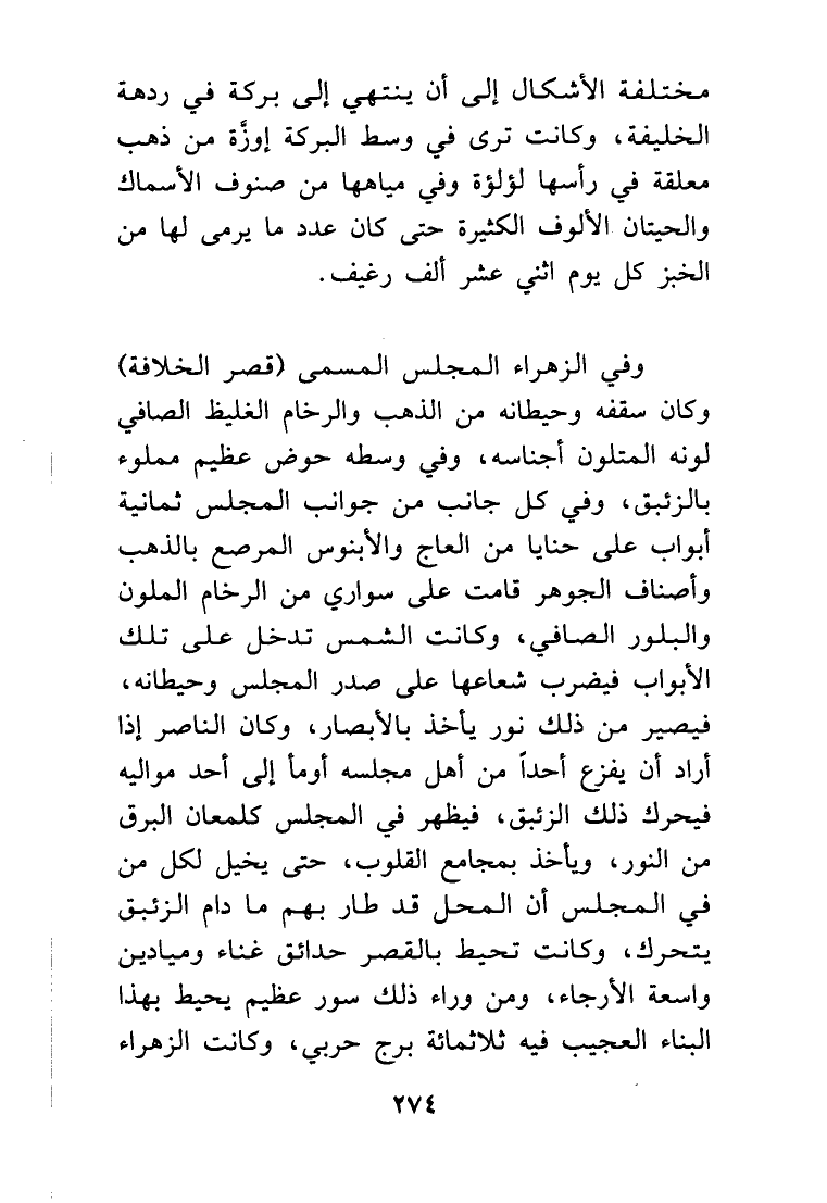 وفي الزهراء المجلس المسمى (قصر الخلافة) وكان سقفه وحيطانه من الذهب والرخام الغليظ الصافي لون المتلون أجناسه، وفي وسطه حوض عظيم مملوء بالزئبق، وفي كل جانب من جوانب المجلس ثمانية أبواب على حنايا من العاج والأبنوس المرصع بالذهب وأصناف الجواهر قامت على سواري من الرخام الملون والبلور الصافي، وكانت الشمس تدخل على تلك الأبواب فيضرب شعاعها على صدر المجلس وحيطانه، فيصير من ذلك نور يأخذ بالأبصار، وكان الناصر إذا أراد أن يفزع أحداً من أهل مجلسه أومأ إلى أحد مواليه فيحرك ذلك الزئبق، فيظهر في المجلس كلمعان البرق من النور، ويأخذ بمجامع القلوب، حتى يخيل لكل من في المجلس أو المحل قد طار بهم ما دام الزئبق يتحرك.