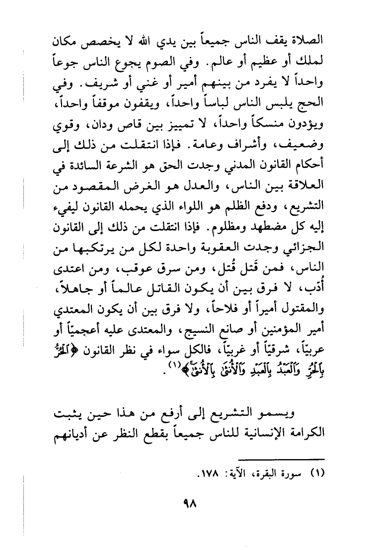 الصلاة يقف الناس جميعا بين يدي الله لا يخصص مكانا لملك أو عظيم أو عالم. وفي الصوم يجوع الناس جوعا واحدا لا يفرد من بينهم أمير، أو غني، أو شريف. وفي الحجّ يلبس الناس لباسًا واحدًا، ويقفون موقفاً واحداً، ويؤدون منسكاً واحداً، لا تمييز بين قاص ودان، وقوي وضعيف، وأشراف وعامة. فإذا انتقلت من ذلك إلى أحكام القانون المدني وجدت الحق هو الشرعة السائدة في العلاقة بين الناس، والعدل هو الغرض المقصود من التشريع، ودفع الظلم هو اللواء الذي يحمله القانون ليفئ إليه مضطهد ومظلوم. فإذا انتقلت من ذلك إلي القانون الجزائي وجدت العقوبة واحدة لكل من يرتكبها من الناس، فمن قتل قُتل، ومن سرق عوقب، ومن اعتدى أُدب، لا فرق بين أن يكون القاتل عالما أو جاهلا، والمقتول أميرا أو فلاحا، ولا فرق بين أن يكون المعتدي أمير المؤمنين، أو صانع النسيج، والمعتدي عليه أعجمياً أو عربياً، شرقياً أو غربياً، فالكل سواء في نظر القانون {الْحُرُّ بِالْحُرِّ وَالْعَبْدُ بِالْعَبْدِ وَالأُنْثَى بِالأُنْثَى} (¬1).