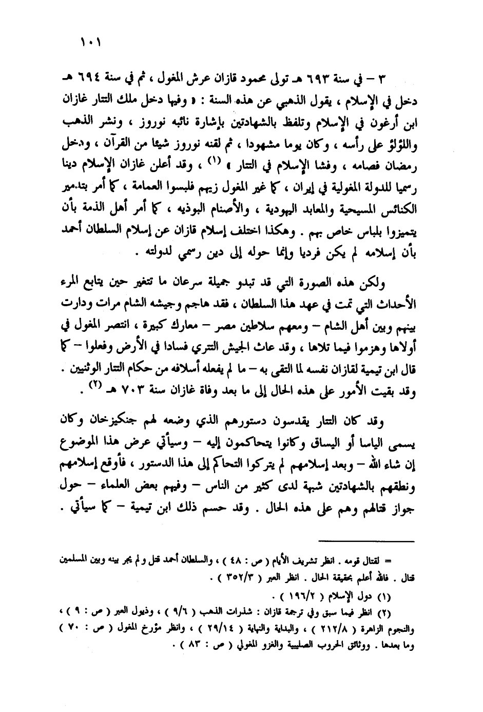 (¬2) انظر فيما سبق وفي ترجمة قازان: شذرات الذهب (6/9) ، وذيول العبر (ص:9) ، والنجوم الزاهرة (8/212) ، والبداية والنهاية (14/29) ، وانظر مؤرخ المغول (ص: 70) وما بعدها. ووثائق الحروب الصليبية والغزو المغولي (ص: 83) .