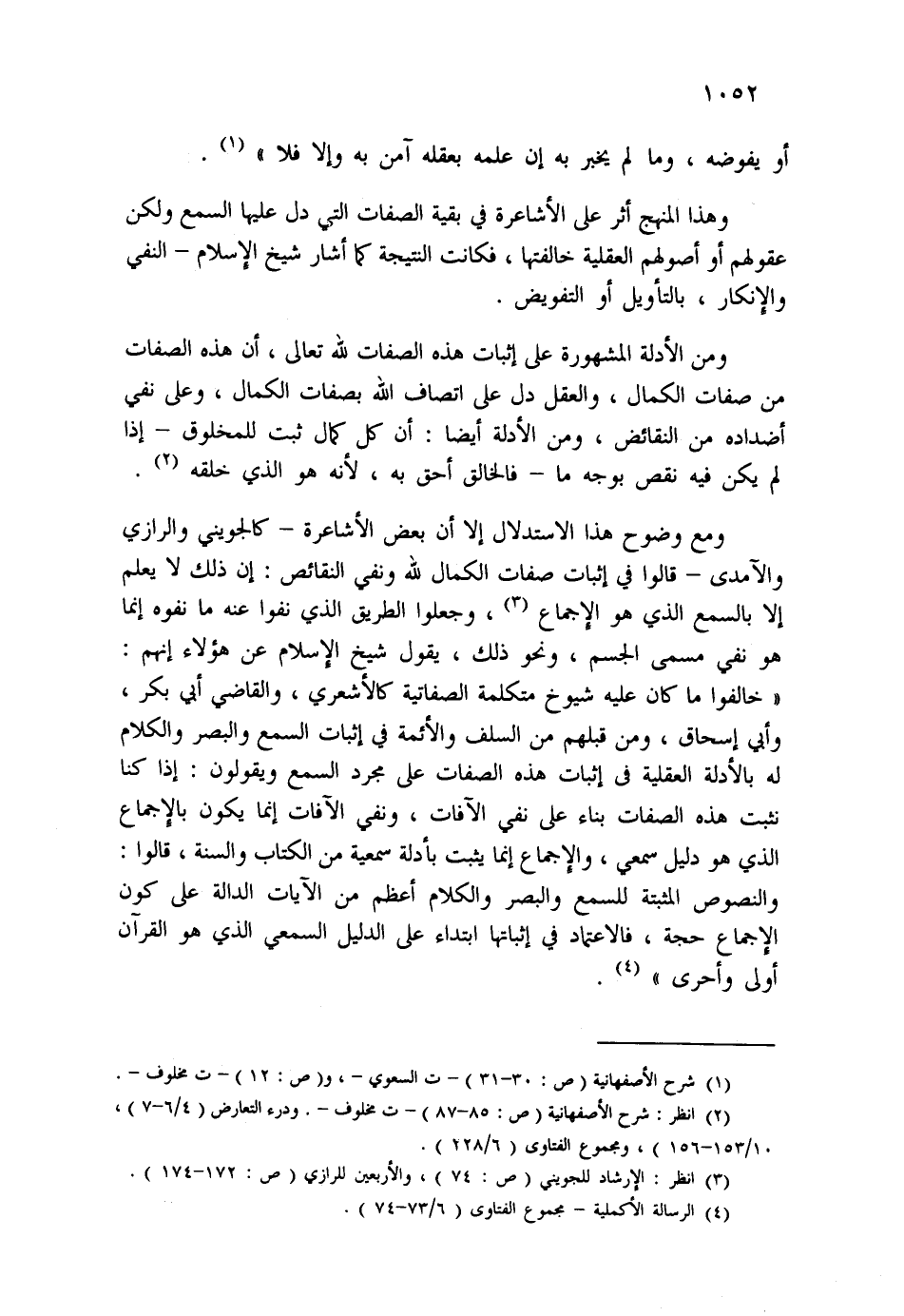 ومع وضوح هذا الاستدلال إلا أن بعض الأشاعرة- كالجويني والرازي والآمدي- قالوا في إثبات صفات الكمال لله ونفي النقائص: إن ذلك لا يعلم إلا بالسمع الذي هو الإجماع (3) ، وجعلوا الطريق الذي نفوا عنه ما نفوه إنما هو نفي مسمى الجسم، ونحو ذلك، يقول شيخ الإسلام عن هؤلاء إنهم: