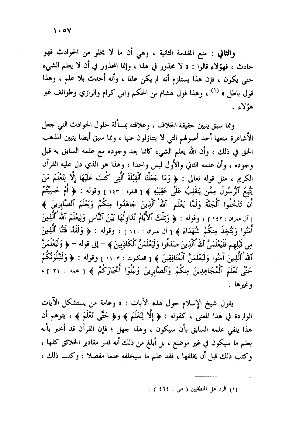 والثاني: منع المقدمة الثانية، وهي أن ما لا يخلو من الحوادث فهو حادث، فهؤلاء قالوا: "لا محذور في هذا، وإنما المحذور في أن لا يعلم الشيء حتى يكون، فإن هذا يستلزم أنه لم يكن عالما، وأنه أحدث بلا علم، وهذا قول باطل" (1) ، وهذا قول هشام بن الحكم وابن كرام والرازي وطوائف غير هؤلاء.