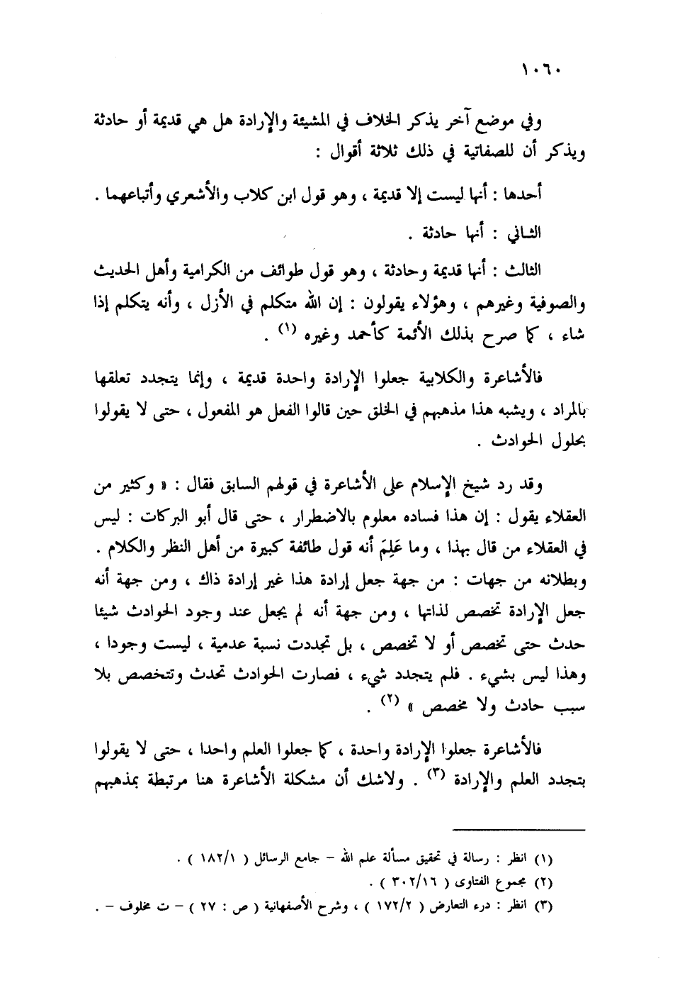 وفي موضع آخر يذكر الخلاف في المشيئة والإرادة هل هي قديمة أو حادثة ويذكر أن للصفاتية في ذلك ثلاثة أقوال:
