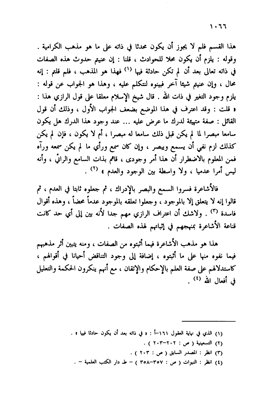 فالأشاعرة فسروا السمع والبصر بالإدراك، ثم جعلوه ثابتا في العدم، ثم قالوا إنه لا يتعلق إلا بالموجود، وجعلوا تعلقه بالموجود عدماً محضاً، وهذه أقوال فاسدة (3) . ولاشك أن اعتراف الرازي مهم جدا لأنه بين إلى أي حد كانت قناعة الأشاعرة بمنهجهم في إثباتهم لهذه الصفات.