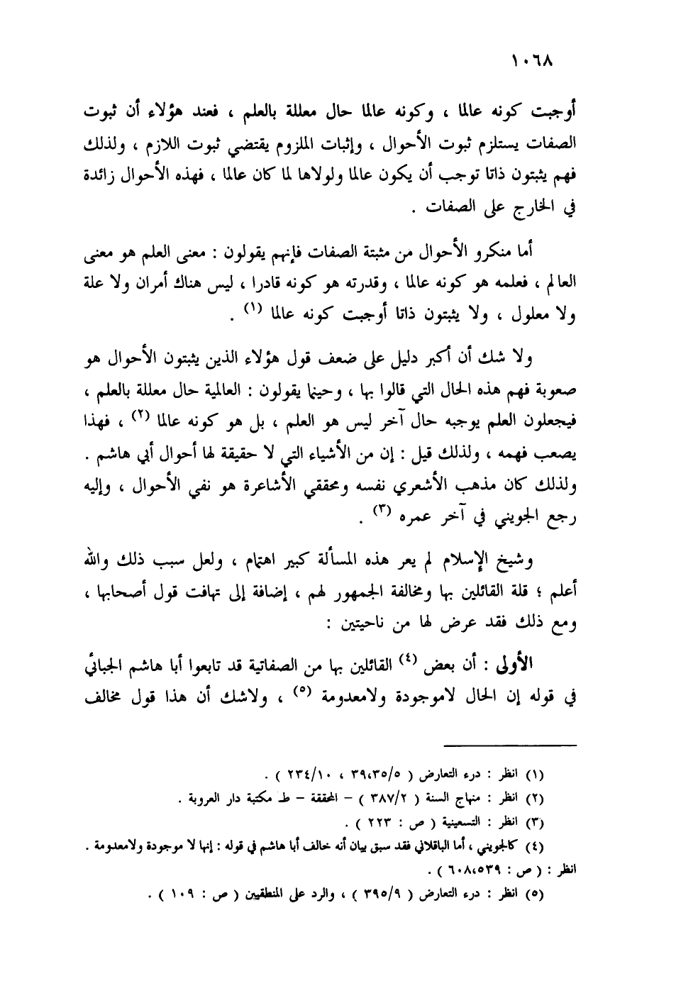 ولا شك أن أكبر دليل على ضعف قول هؤلاء الذين يثبتون الأحوال هو صعوبة فهم هذه الحال التي قالوا بها، وحينما يقولون: العالمية حال معللة بالعلم، فيجعلون العلم يوجبه حال آخر ليس هو العلم، بل هو كونه عالما (2) ، فهذا يصعب فهمه، ولذلك قيل: إن من الأشياء التي لا حقيقة لها أحوال أبي هاشم.