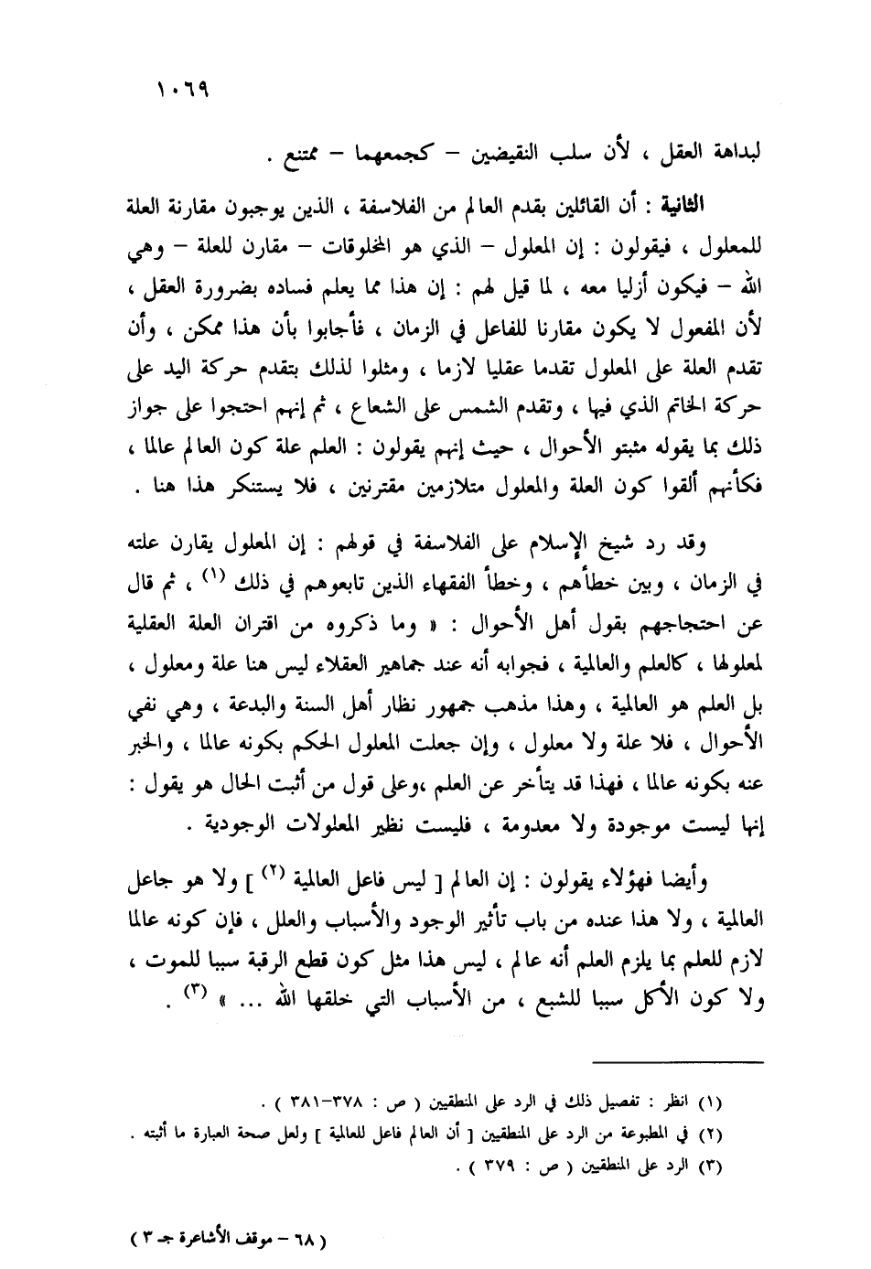 الثانية: أن القائلين بقدم العالم من الفلاسفة، الذين يوجبون مقارنة العلة للمعلول، فيقولون: إن المعلول- الذي هو المخلوقات- مقارن للعلة- وهي اللهـ فيكون أزليا معه، لما قيل لهم: إن هذا مما يعلم فساده بضرورة العقل، لأن إلمفعول لا يكون مقارنا للفاعل في الزمان، فأجابوا بأن هذا ممكن، وأن تقدم العلة على المعلول تقدما عقليا لازما، ومثلوا لذلك بتقدم حركة اليد على حركة الخاتم الذي فيها، وتقدم الشمس على الشعاع، ثم إنهم احتجوا على جواز ذلك بما يقوله مثبتو الأحوال، حيث إنهم يقولون: العلم علة كون العالم عالما، فكأنهم ألقوا كون العلة والمعلول متلازمين مقترنين، فلا يستنكر هذا هنا.
