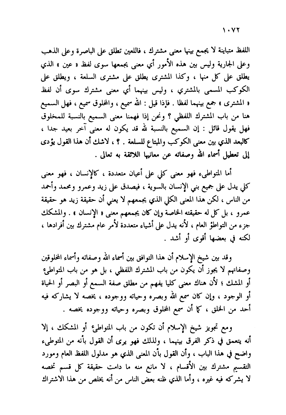 وقد بين شيخ الإسلام أن هذا التوافق بين أسماء الله وصفاته وأسماء المخلوقين وصفاتهم لا يجوز أن يكون من باب المشترك اللفظي، بل هو من باب المتواطئ أو المشك، لأن هناك معنى كليا يفهم من مطلق صفة السمع أو البصر أو الحياة أو الوجود، وإن كان سمع الله وبصره وحياته ووجوده، يخصه لا يشاركه فيه أحد من الخلق، كما أن سمع المخلوق وبصره وحياته ووجوده يخصه.