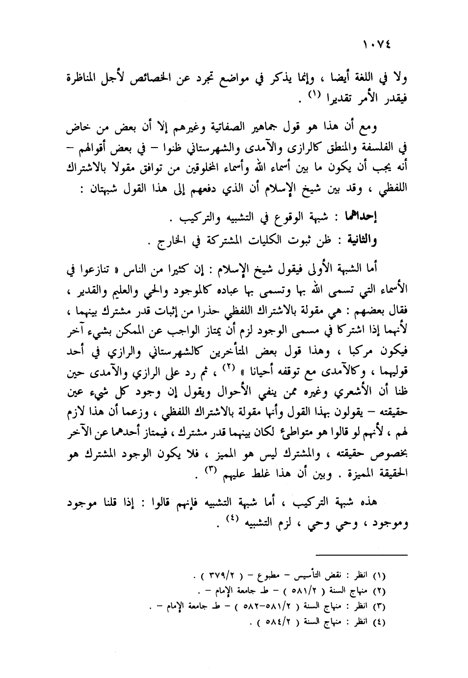 ومع أن هذا هو قول جماهير الصفاتية وغيرهم إلا أن بعض من خاض في الفلسفة والمنطق كالرازي والآمدى والشهرستاني ظنوا - في بعض أقوالهم - أنه يجب أ، يكون ما بين أسماء الله وأسماء المخلوقين من توافق مقولا بالاشتراك اللفظين وقد بين شيخ الإسلام