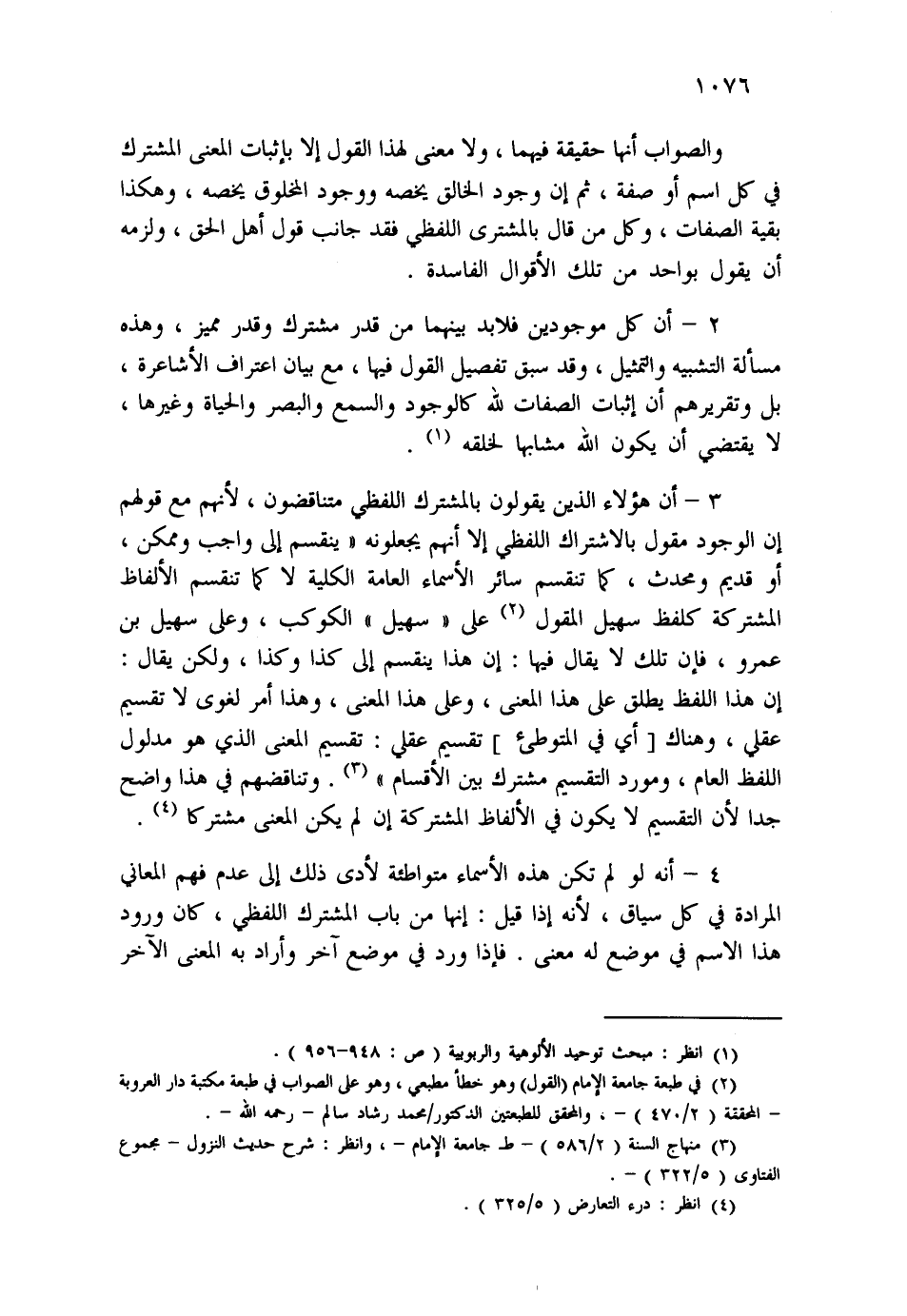 3- أن هؤلاء الذين يقولون بالمشترك اللفظي متناقضون، لأنهم مع قولهم إن الوجود مقول بالاشتراك اللفظي إلا أنهم يجعلونه "ينقسم إلى واجب وممكن، أو قديم ومحدث، كما تنقسم سائر الأسماء العامة الكلية لا كما تنقسم الألفاظ المشتركة كلفظ سهيل المقول (¬2) على "سهيل" الكوكب، وعلى سهيل بن عمرو، فإن تلك لا يقال فيها: إن هذا ينقسم إلى كذا وكذا، ولكن يقال: إن هذا اللفظ يطلق على هذا المعنى، وعلى هذا المعنى، وهذا أمر لغوي لا تقسيم عقلي، وهناك [أي في المتوطئ] تقسيم عقلي: تقسيم المعنى الذي هو مدلول اللفظ العام، ومورد التقسيم مشترك بين الأقسام" (¬3) . وتناقضهم في هذا واضح جداً لأن التقسيم لا يكون في الألفاظ المشتركة إن لم يكن المعنى مشتركاً (¬4) .