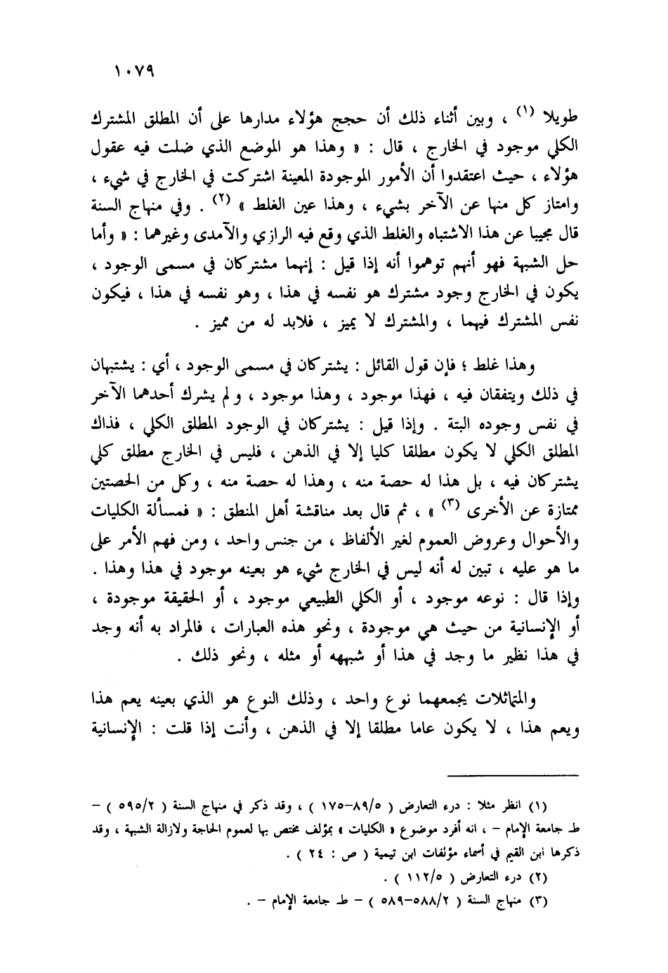 طويلاً (¬1) ، وبين أثناء ذلك أن حجج هؤلاء مدارها على أن المطلق المشترك الكلي موجود في الخارج، قال: "وهذا هو الموضع الذي ضلت فيه عقول هؤلاء، حيث اعتقدوا أن الأمور الموجودة المعينة اشتركت في الخارج في شيء، وامتاز كل منها عن الآخر بشيء، هذا عين الغلط" (¬2) . وفي منهاج السنة قال مجيبا عن هذا الاشتباه والغلط الذي وقع فيه الرازي والآمدي وغيرهما: "وأما حل الشبهة فهو أنهم توهموا أنه إذا قيل: إنهما مشتركان في مسمى الوجود، يكون في الخارج وجود مشترك هو نفسه في هذا، وهو نفسه في هذا، فيكون نفس المشترك فيهما، والمشترك لا يميز، فلا بد له من مميز.
